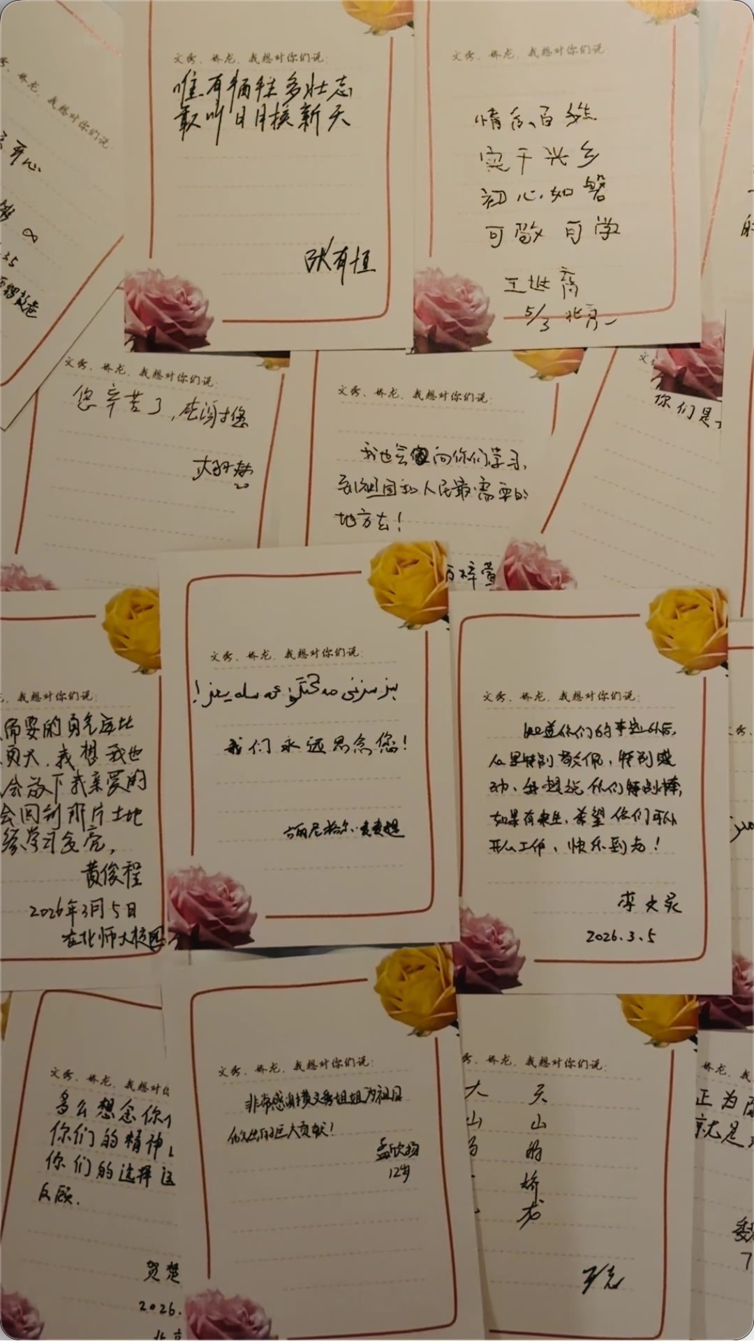 最让他印象深刻的,是两个街边少年的反应。他回忆说,当时两个男孩正坐在路边吃东西,但看到两朵月季花的图片、听到黄文秀和贺娇龙的故事后,两个孩子立即放下了手里的食物,认真听着,最后还在明信片上写下了“我们要向你们学习,也希望自己变得更好”的真诚留言。