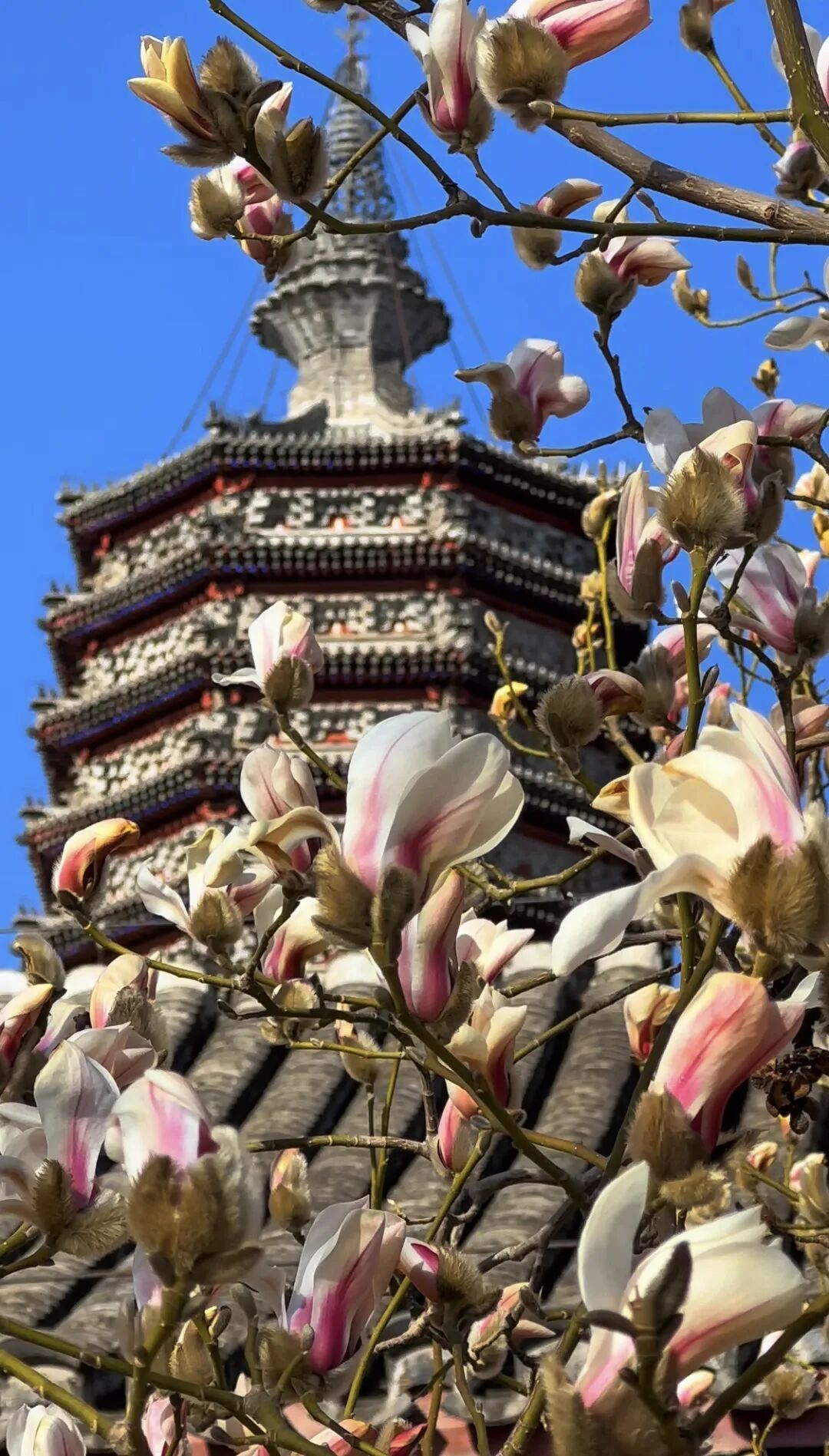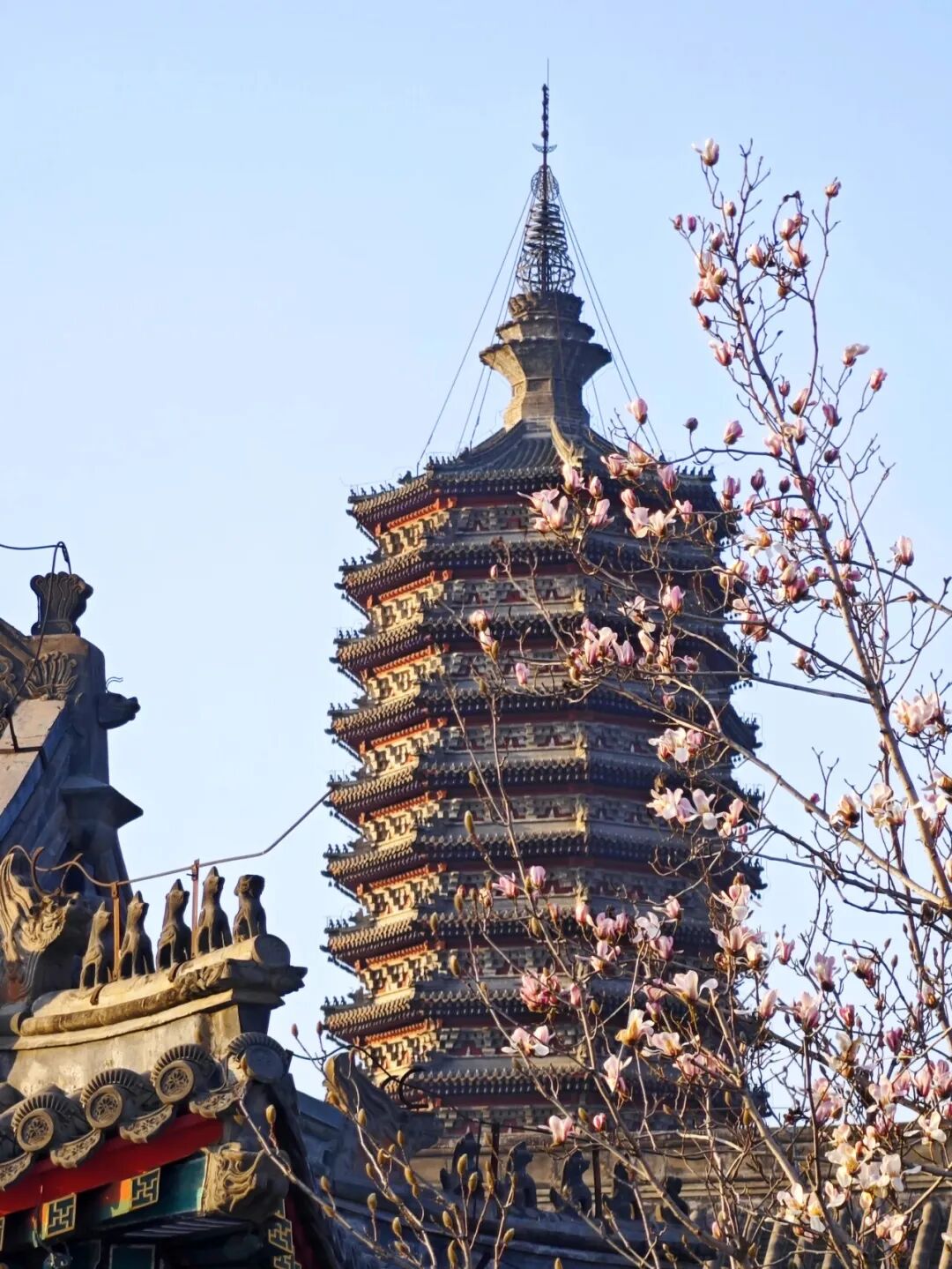 花瓣映衬着古塔与朱墙
