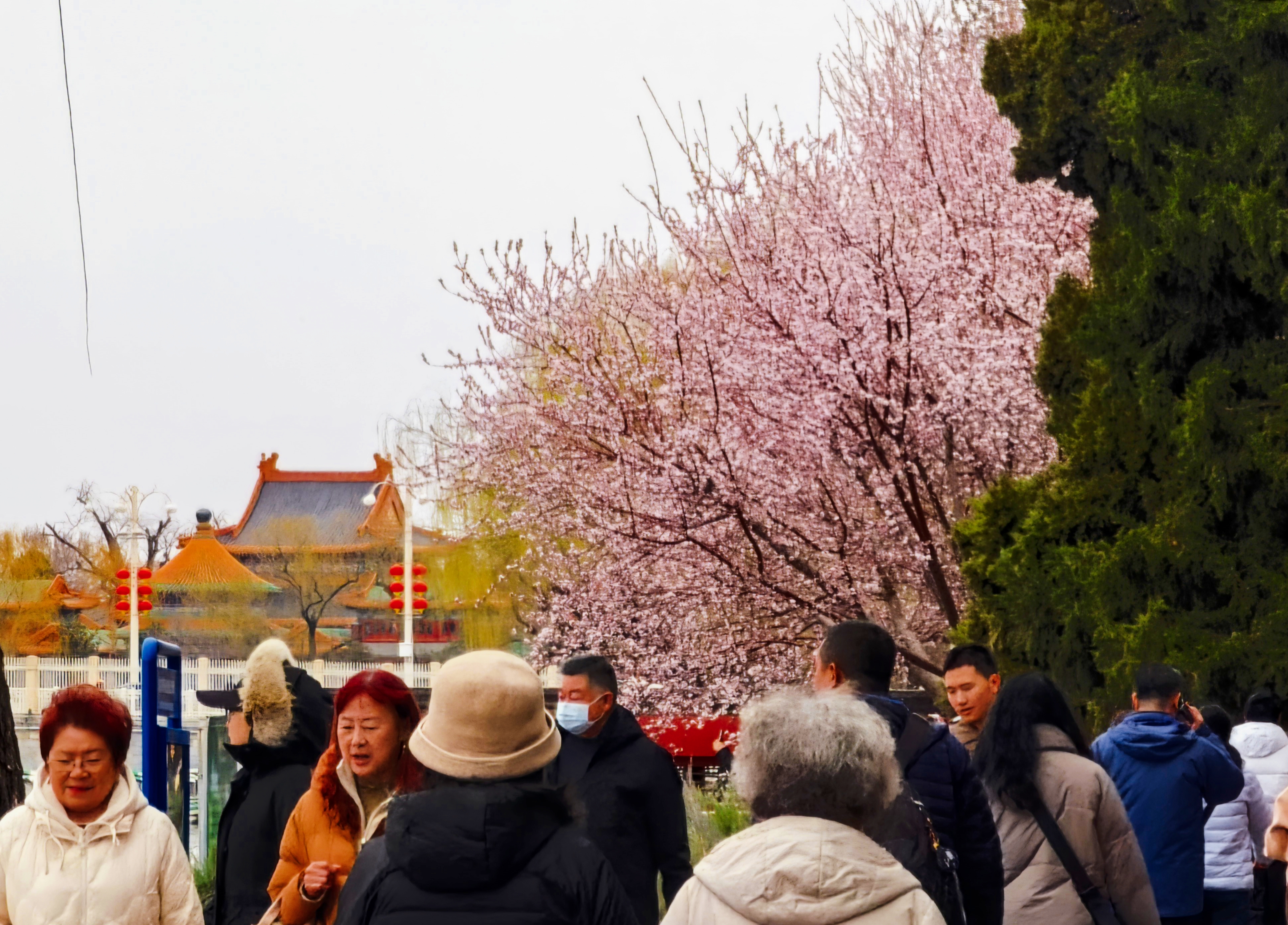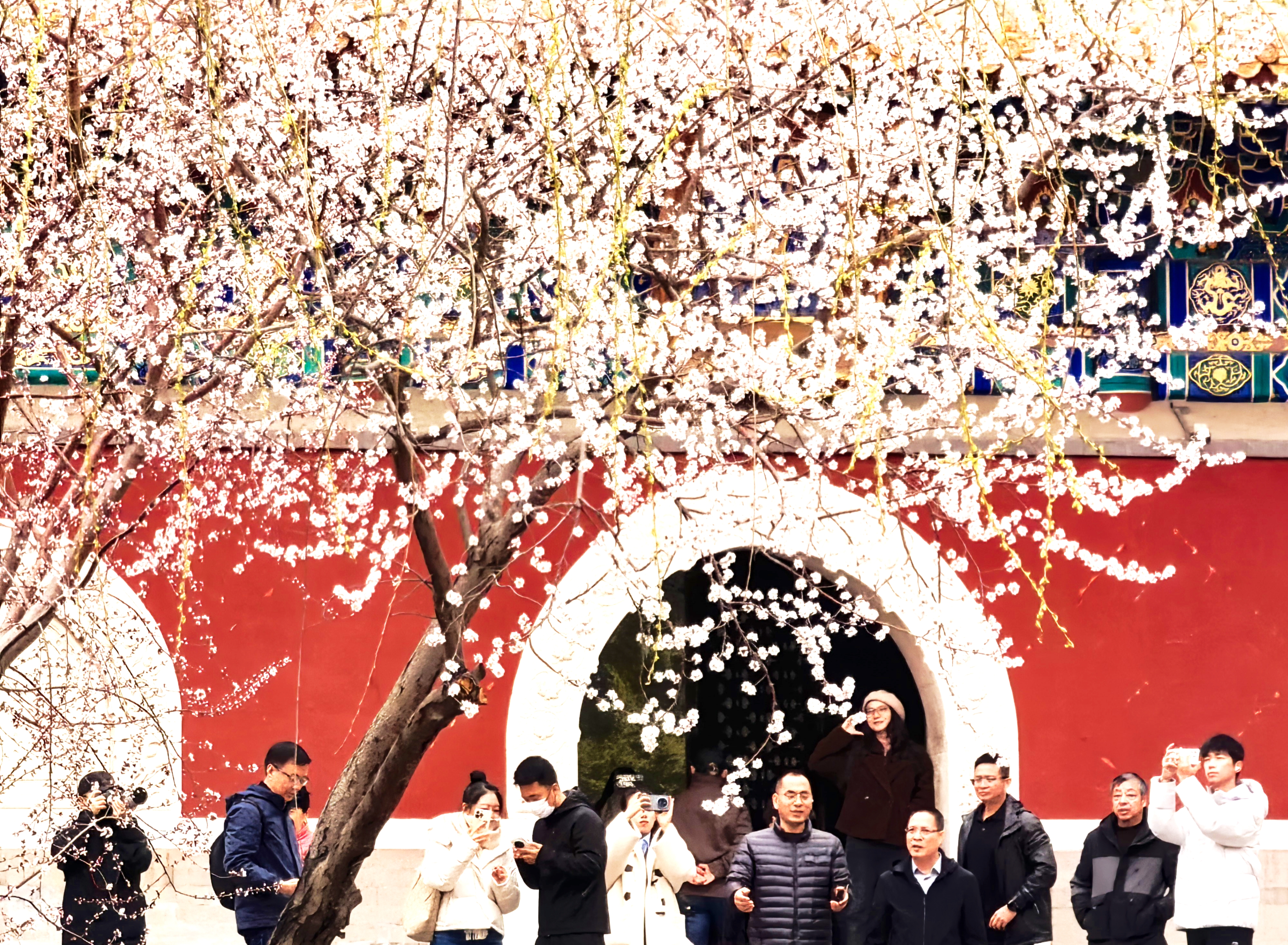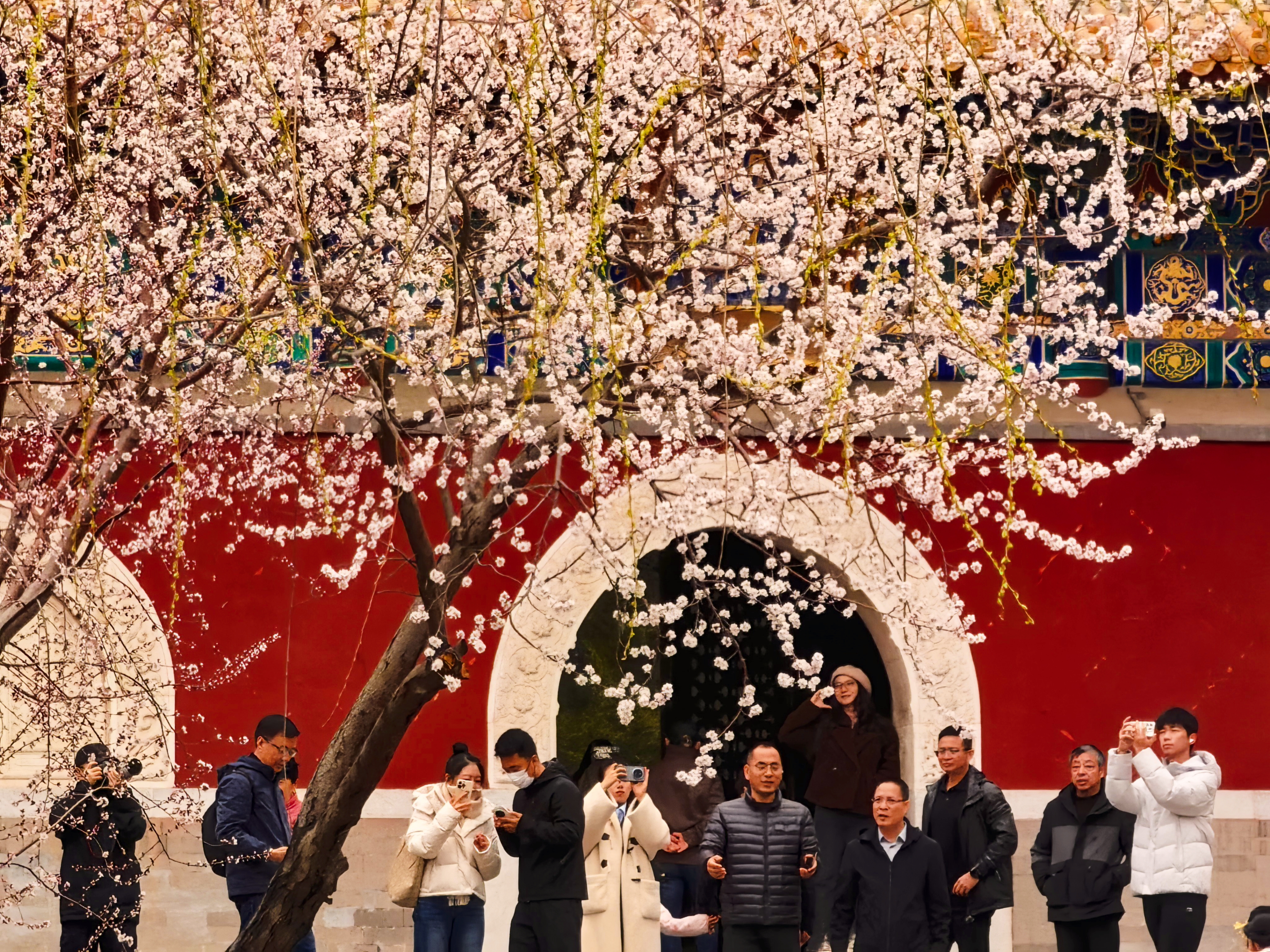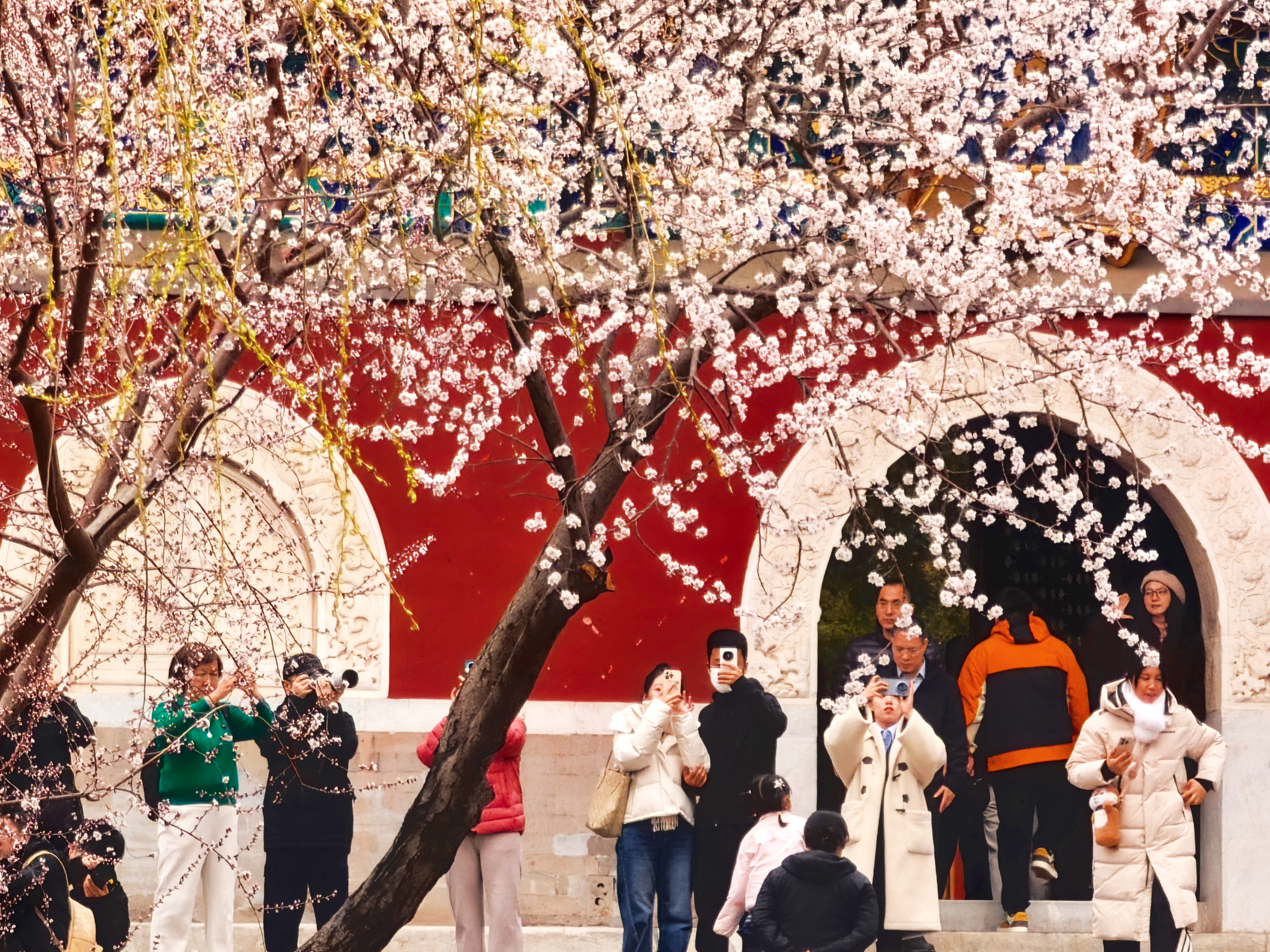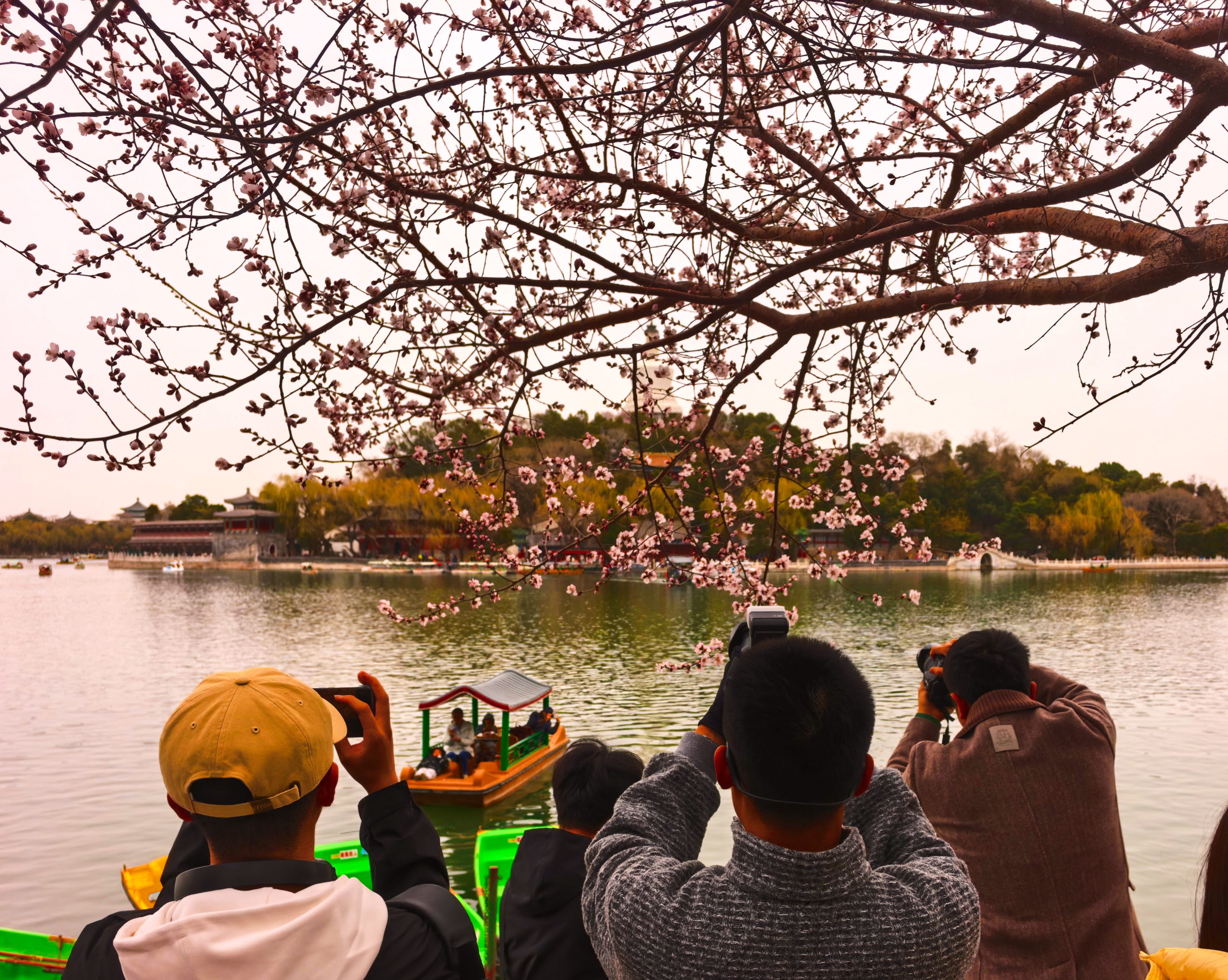 桃花红墙映白塔,北海公园春色醉游人