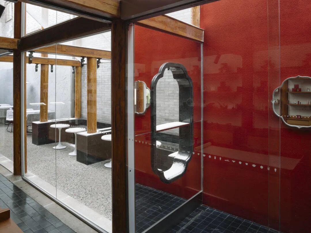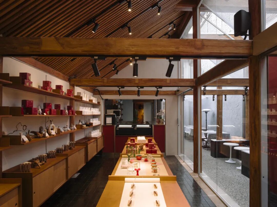 离鼓楼不远的地安门外大街20号,细窄的门头不经意可能就错过了。但是走入其中,经过令人眼前一亮的中国红的通道,里面的景象却令人豁然开朗,两层挑高的雅致空间,室内外座位各有各美景,丰富的茶饮和文创产品,二层露台还能看到钟鼓楼的风光。