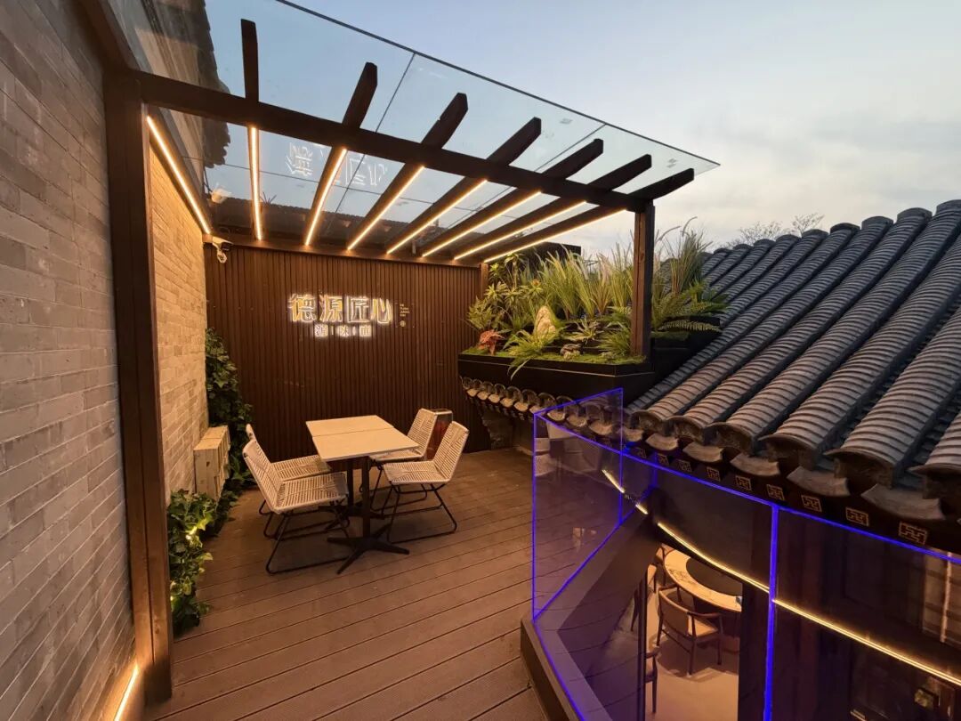 该店负责人介绍,这里原本是一处存在消防隐患的杂院,德源集团通过巧妙设计,拆除违建、加固原有建筑,让全新设计的门口廊道成为串联时光的“文化纽带”,它连接两层挑高的仪式性空间,线条流畅兼具现代美感与传统韵味。拾级而上可直达二层露台,这里是遥望鼓楼的绝佳视角。空间的改造不仅实现了空间功能的跃升,更让顾客感受“一步一景,一景一史”的沉浸体验,成为打通历史与现代、市井与雅致的关键节点。
