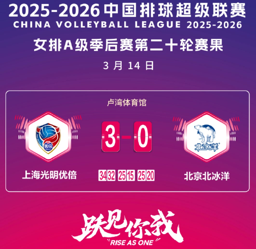 3月14日,2025至2026赛季中国排球超级联赛女排A级季后赛末轮,北京北冰洋女排客战小组头名上海队。北京女排曾在首局化解对手五个局点,但遗憾还是丢掉,最终0比3不敌对手。北京女排接下来将参加联赛五至八名排位赛。