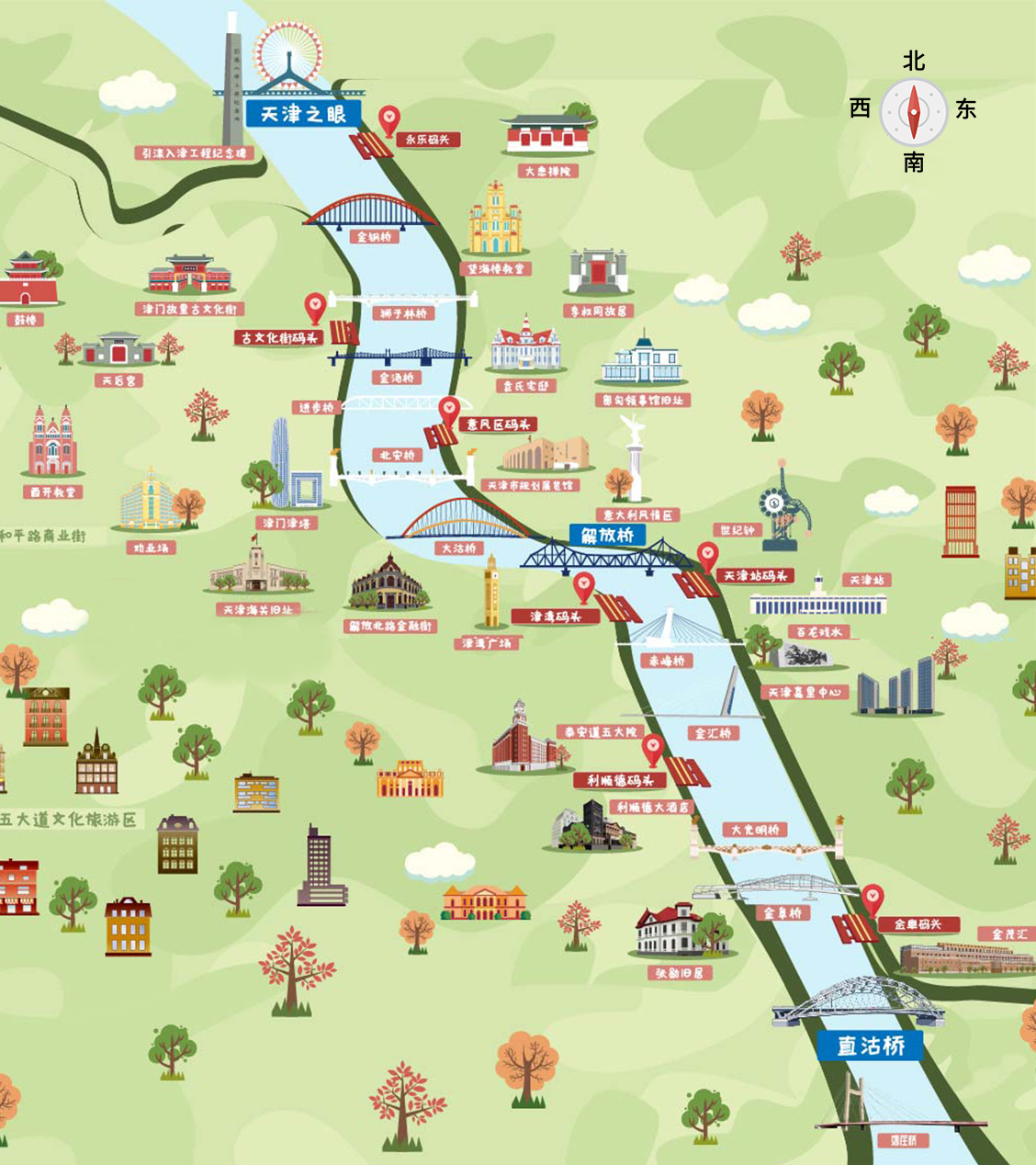 海河游船有日景游和夜景游两条航线,两条航线串联起海河上特色桥梁与两岸历史风貌建筑。