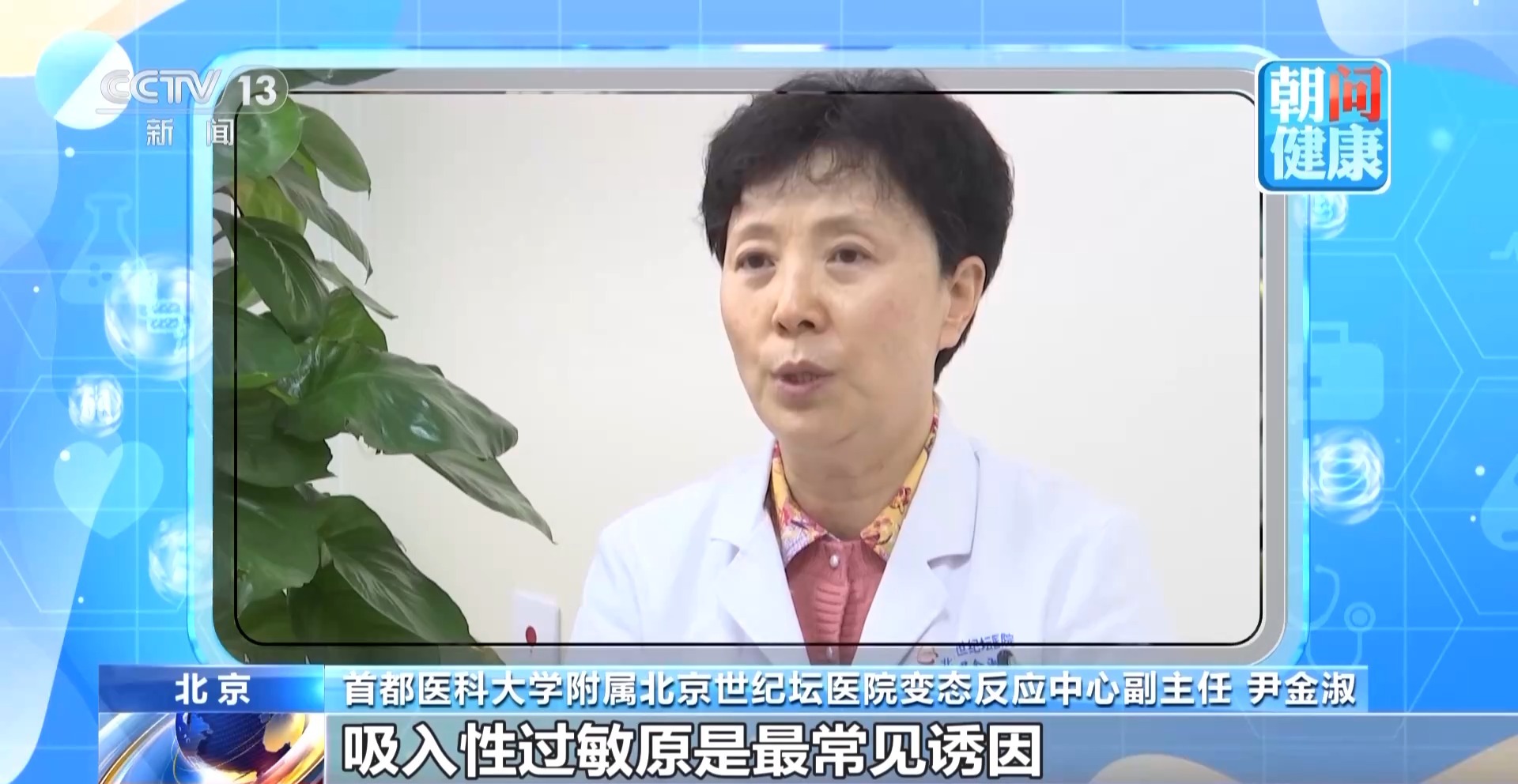 首都医科大学附属北京世纪坛医院变态反应中心副主任 尹金淑:吸入性过敏原是我们最常见的诱因,比如说包括尘螨、霉菌、花粉、动物皮屑等等。食物性过敏原也不容忽视,鸡蛋、牛奶、坚果、 花生等都可能诱发过敏。