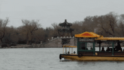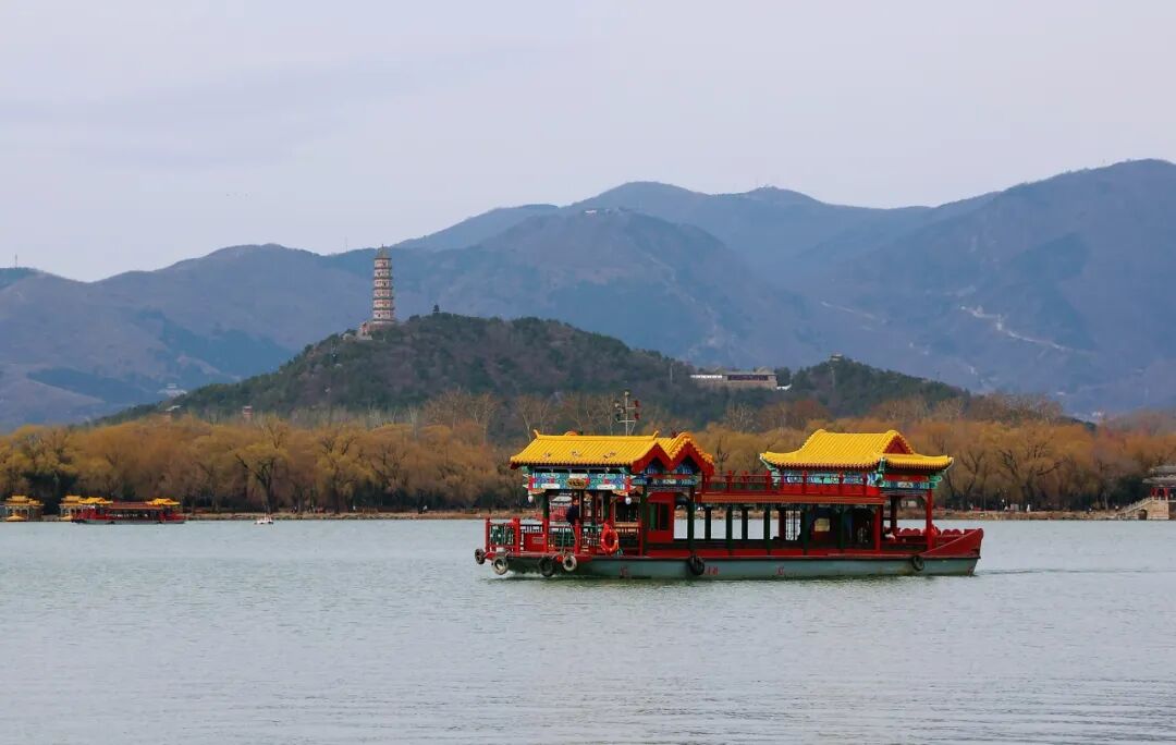 乘坐游船,还可观赏西堤春花景致、昆明湖沿岸建筑景观,远眺玉泉山景观,移步移景,皆是画意。
