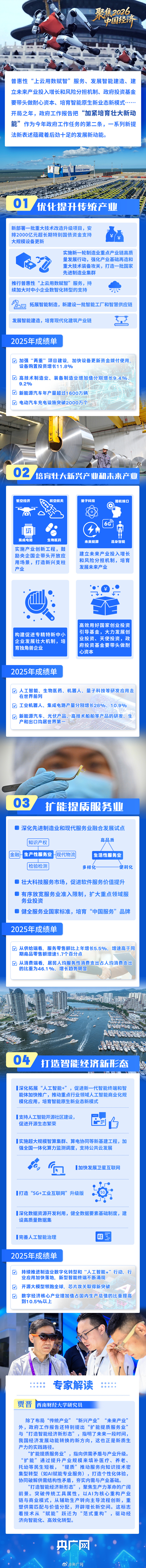 2026年是“十五五”开局之年。政府工作报告将“加紧培育壮大新动能”列入今年十大工作任务第二位,明确提出坚持把发展经济的着力点放在实体经济上,因地制宜发展新质生产力,建设现代化产业体系。培育壮大新动能关键靠什么?今年有哪些新概念新提法,蕴藏着哪些新机会新赛道?