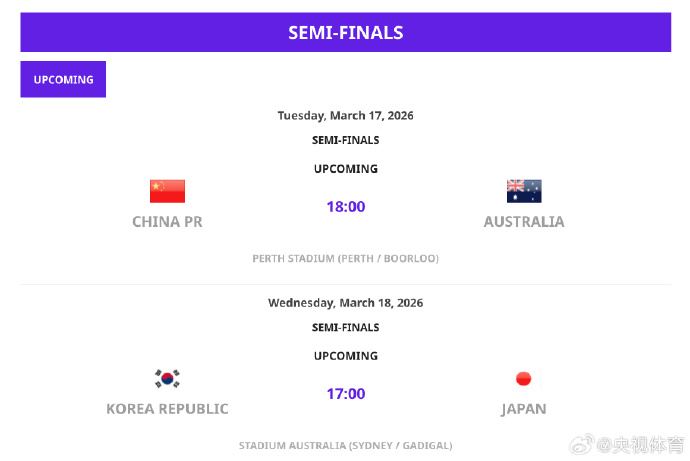 北京时间3月15日,2026亚足联女足亚洲杯两场半决赛对阵出炉,此前2-0战胜中国台北女足的中国女足,将于北京时间3月17日18点对阵东道主澳大利亚。另一场半决赛由韩国女足对阵日本女足。两场比赛的胜者将在3月21日会师决赛。