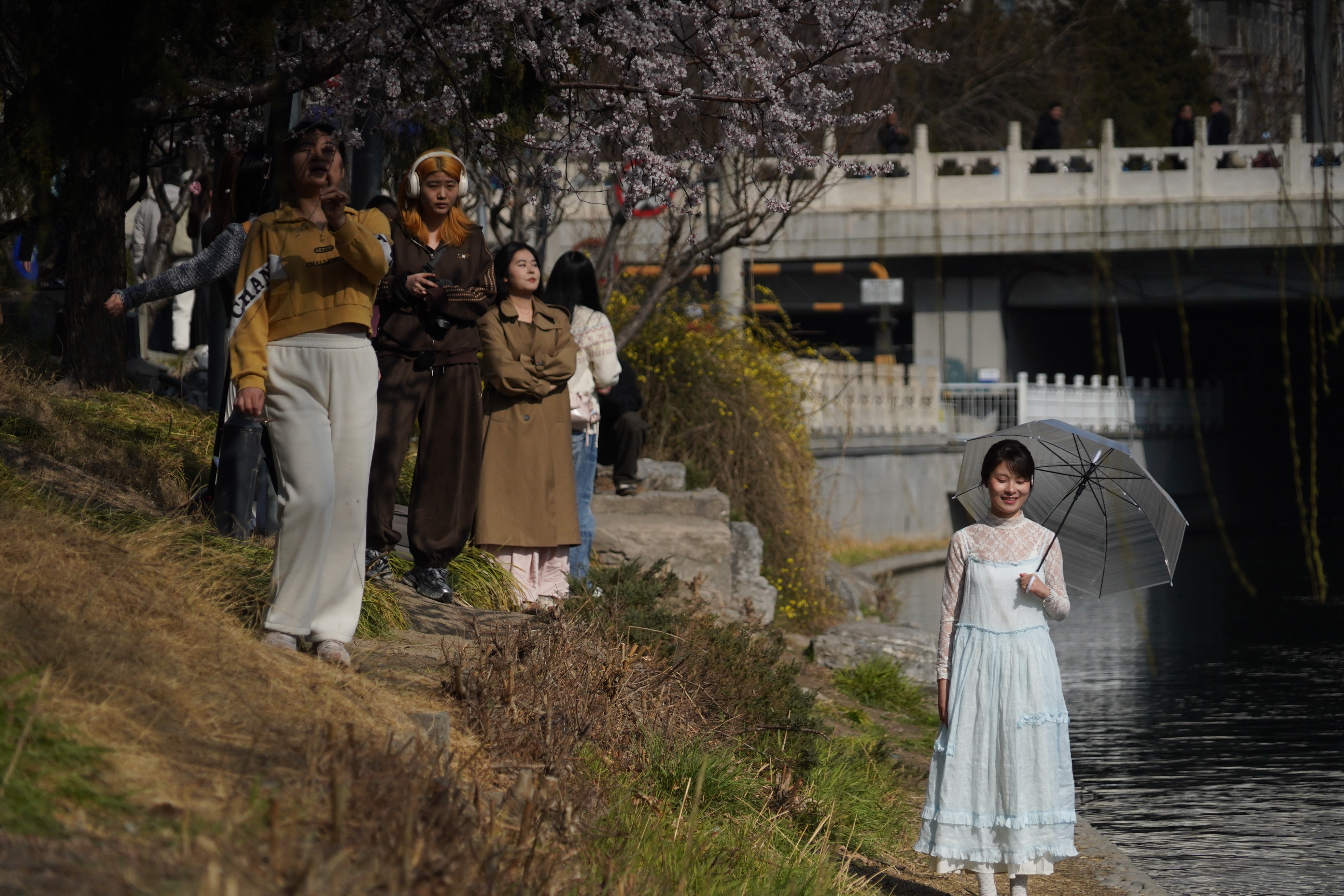 北二环安定门桥西侧北岸山桃花绽放,吸引市民到此打卡拍照。