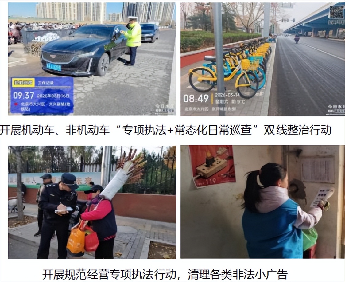其次,街道开展“专项执法+常态化 日常巡查”双线整治,累计组织 1100 余人次。200 余辆“僵尸车”被拖移清理, 7200 余辆乱停乱放的机动车与非机动车被引导规范。针对街面秩序,执法力量以学校、医院、市场周边为重点,累计开展专项执法20 次,规范占道经营30 余起,取缔违规点位8个,清理非法小广告 500 余处,拆除破损、褪色公益广告80余处。从停车规范到经营有序,城市的运行脉搏恢复了稳健节律。