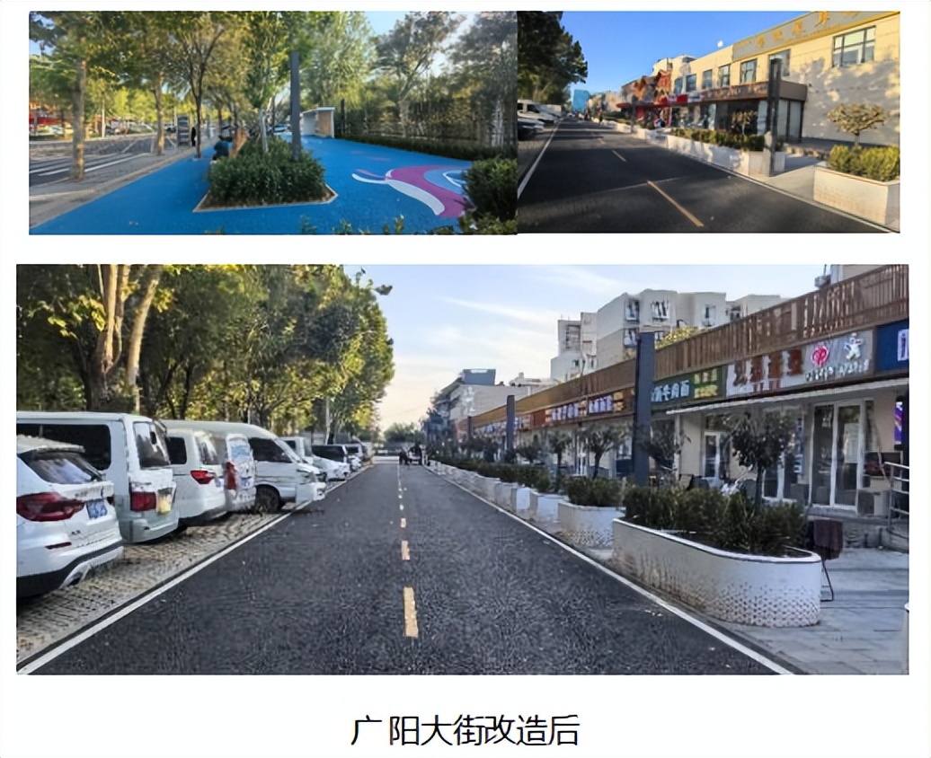 如果说楼道和停车位的改变是“里子”的夯实,那么街角的蜕变则是“ 面子” 的精致升华。广阳大街( 兴亦路-团河路段)的改造,便是典范。