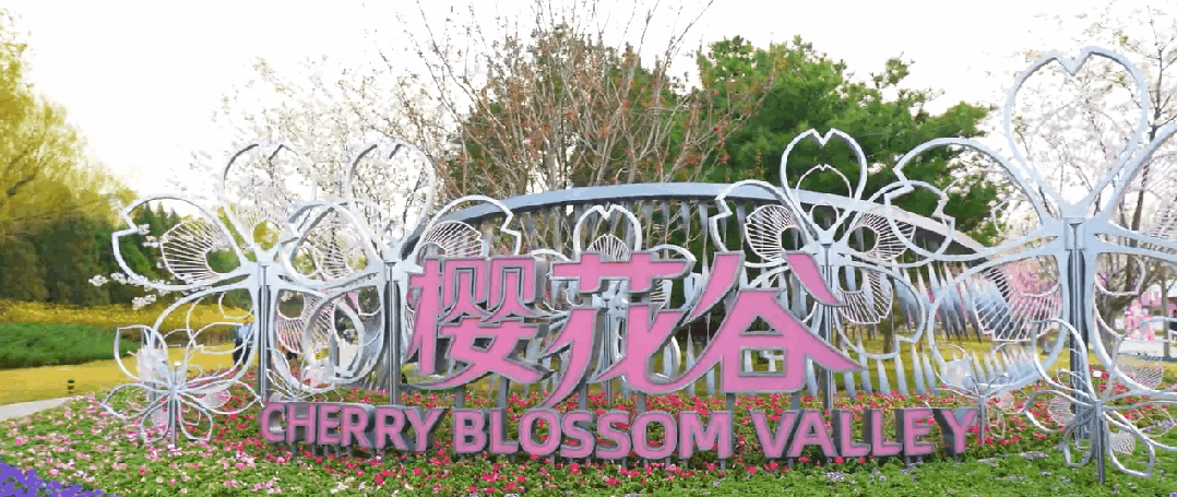 进入公园北门,眼前是一片粉色的浪漫花海。这里是公园的“C位”担当——占地面积达34000平方米的樱花谷。利用原有地形打造的谷地,樱花色的唯美芬芳覆盖整个春日。