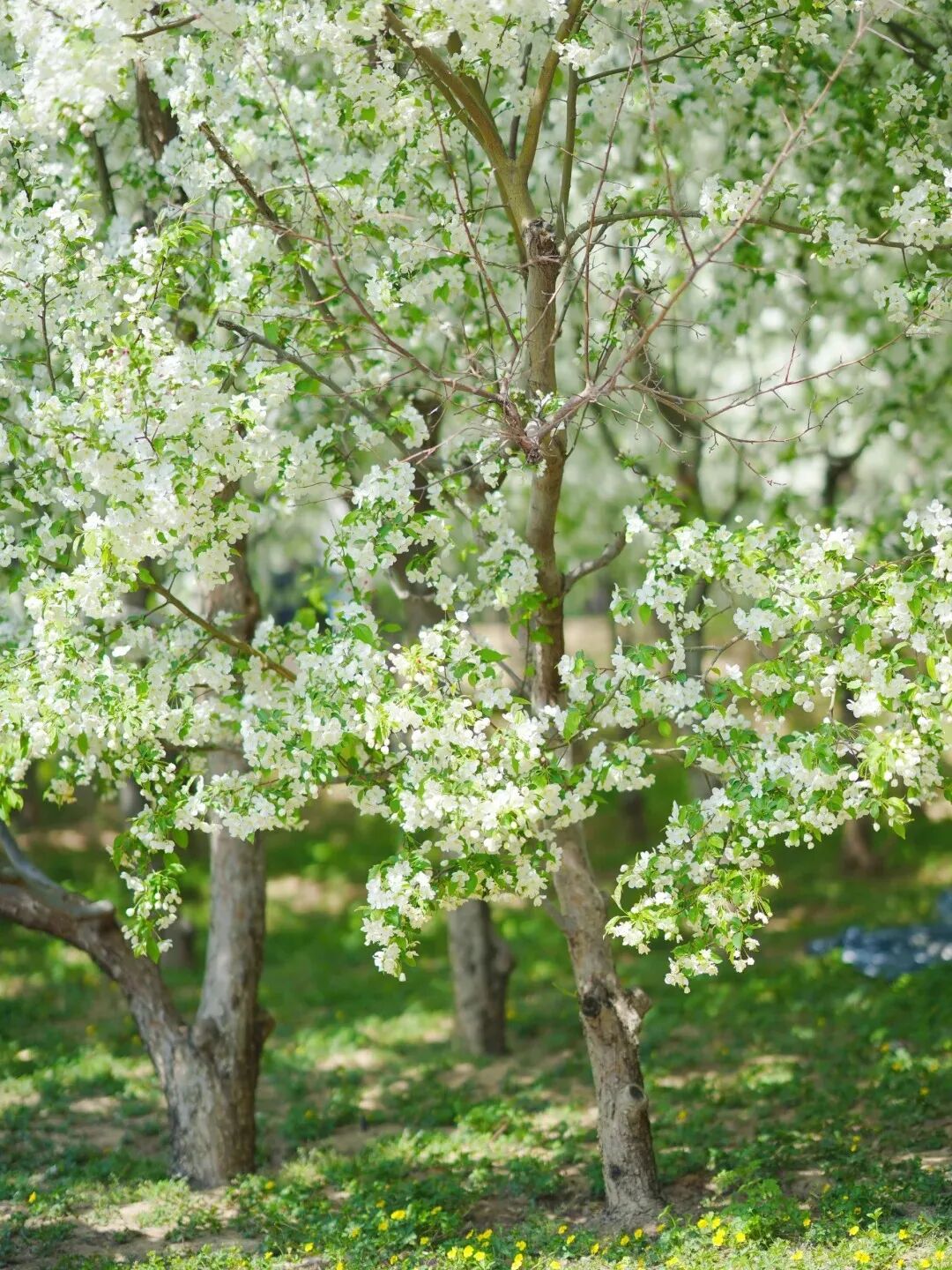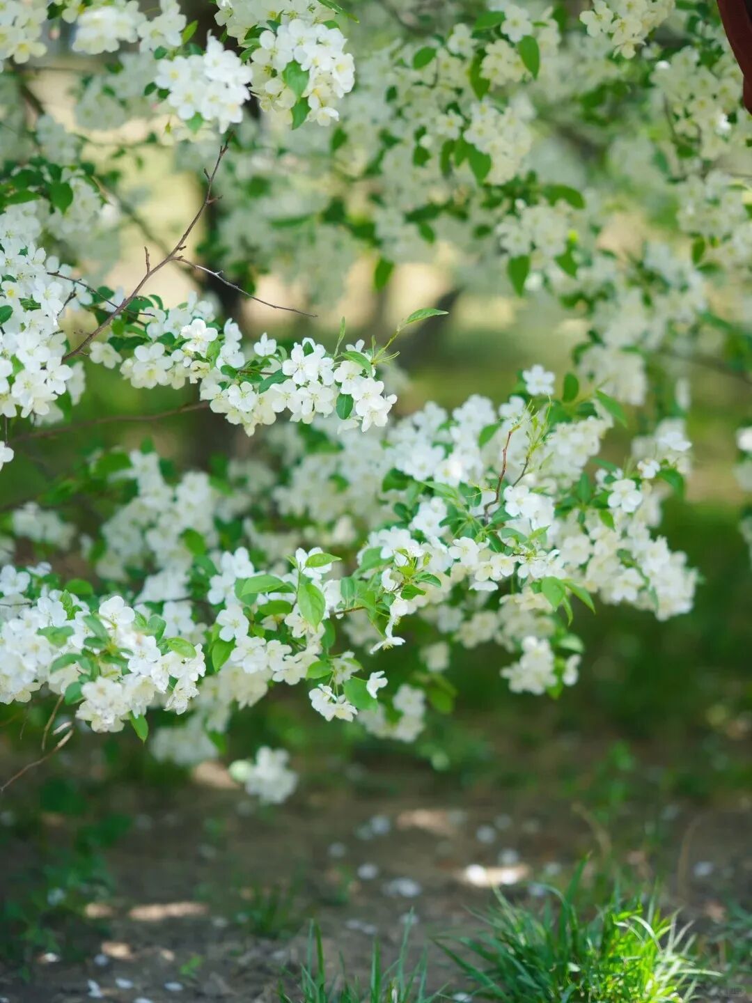 园区内多处海棠花境次第分布,花枝低垂、花团绵密,待到花开满枝,便如素白瀑布般从枝头垂落,清新雅致、温柔治愈。