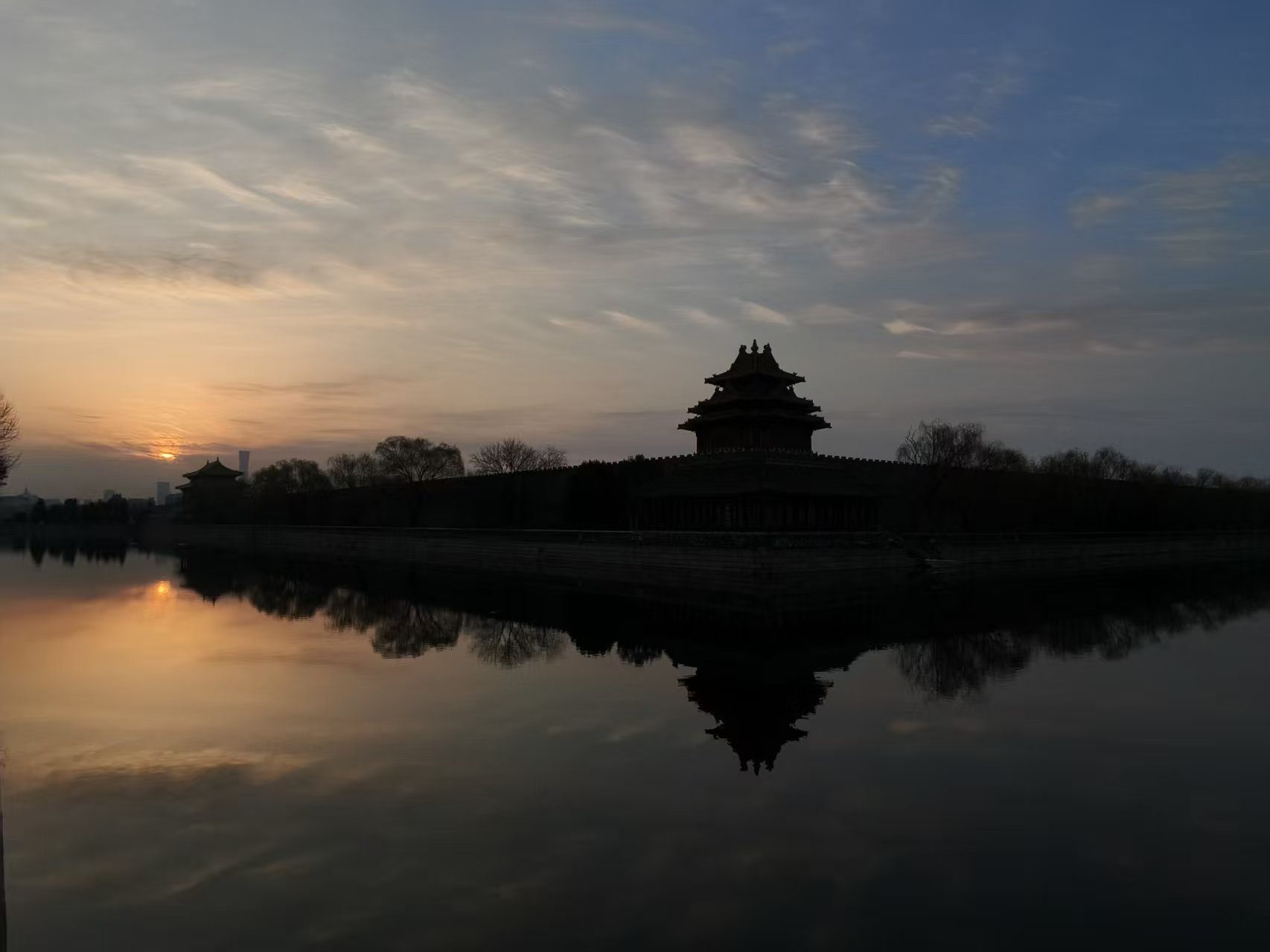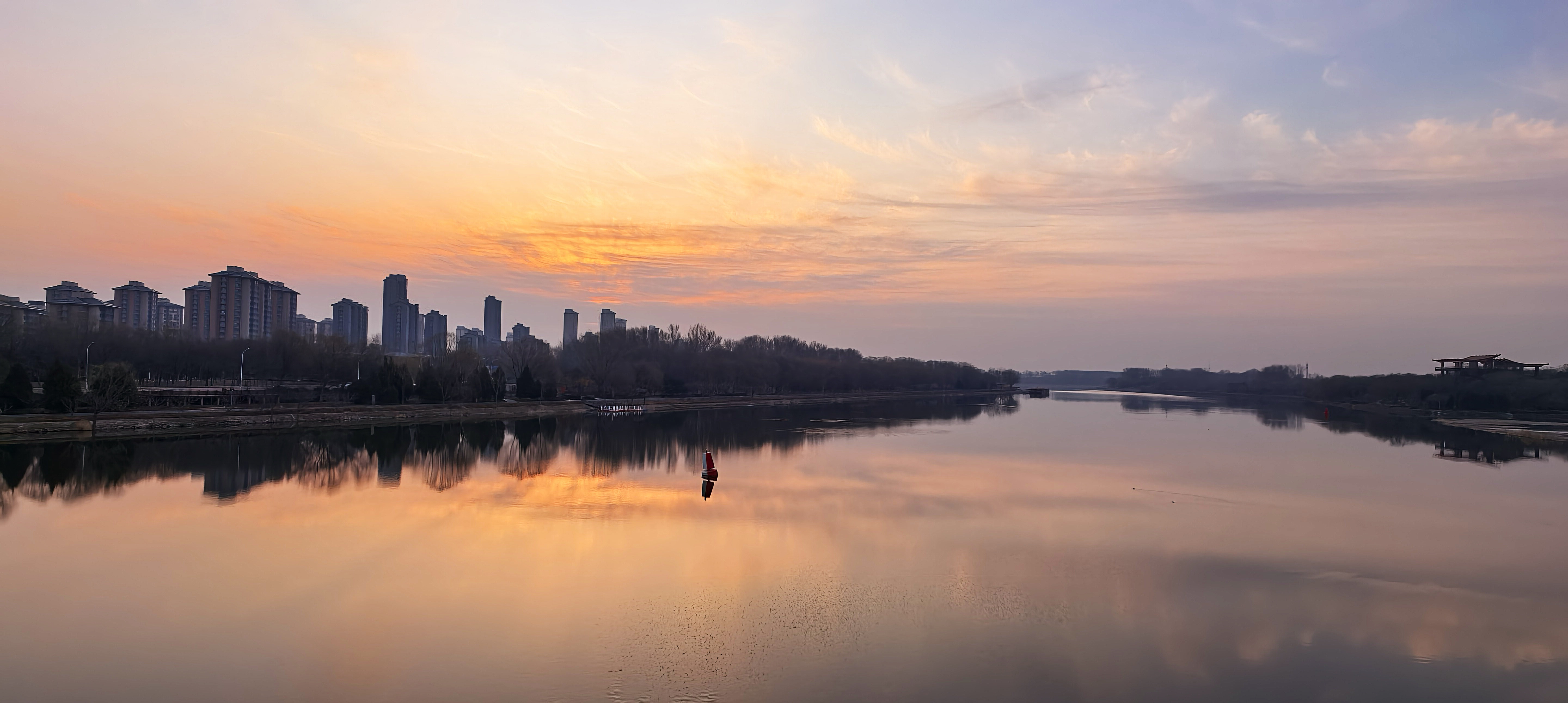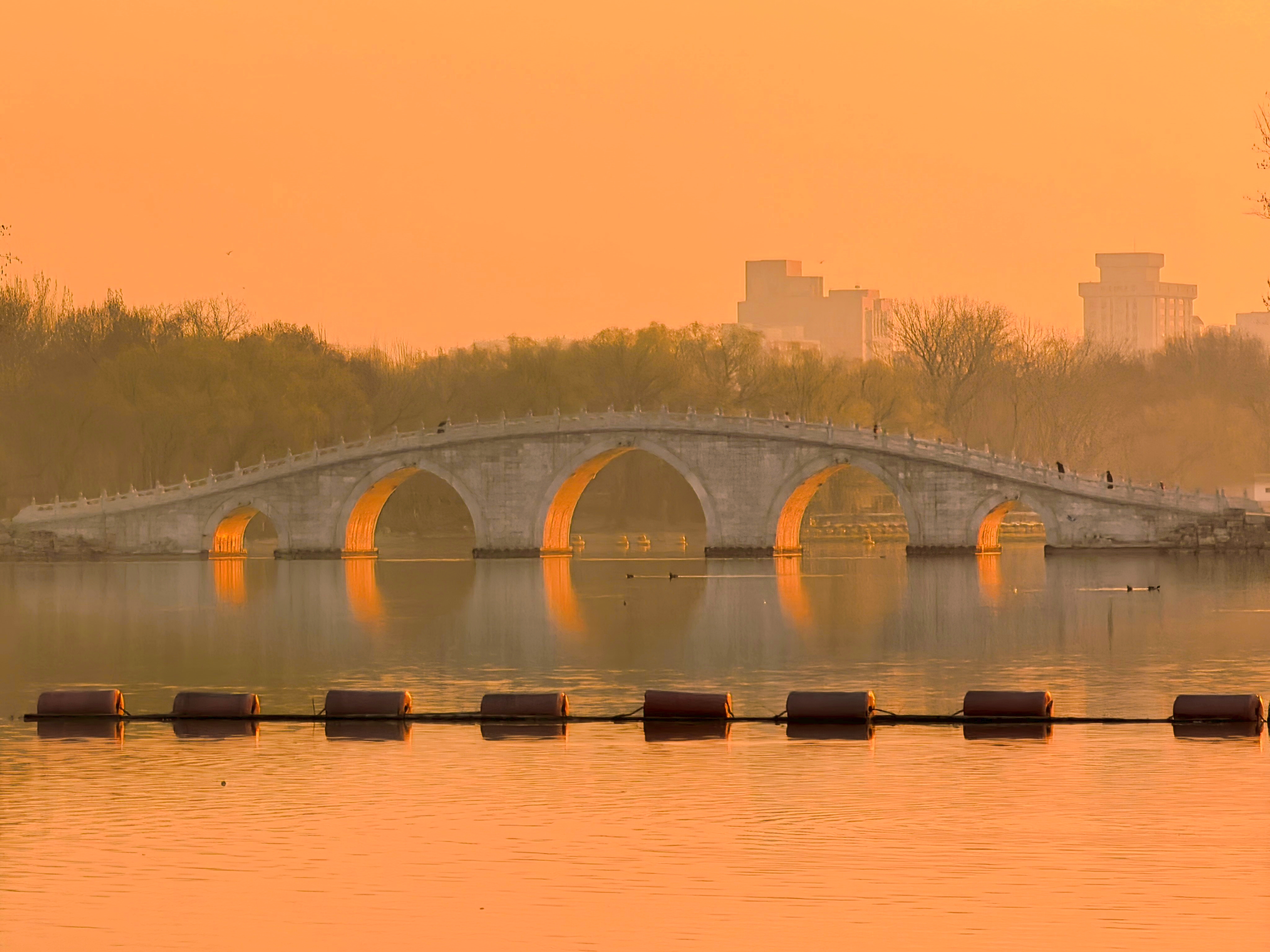 朝霞扮靓北京天空,玉渊潭又现金光穿洞