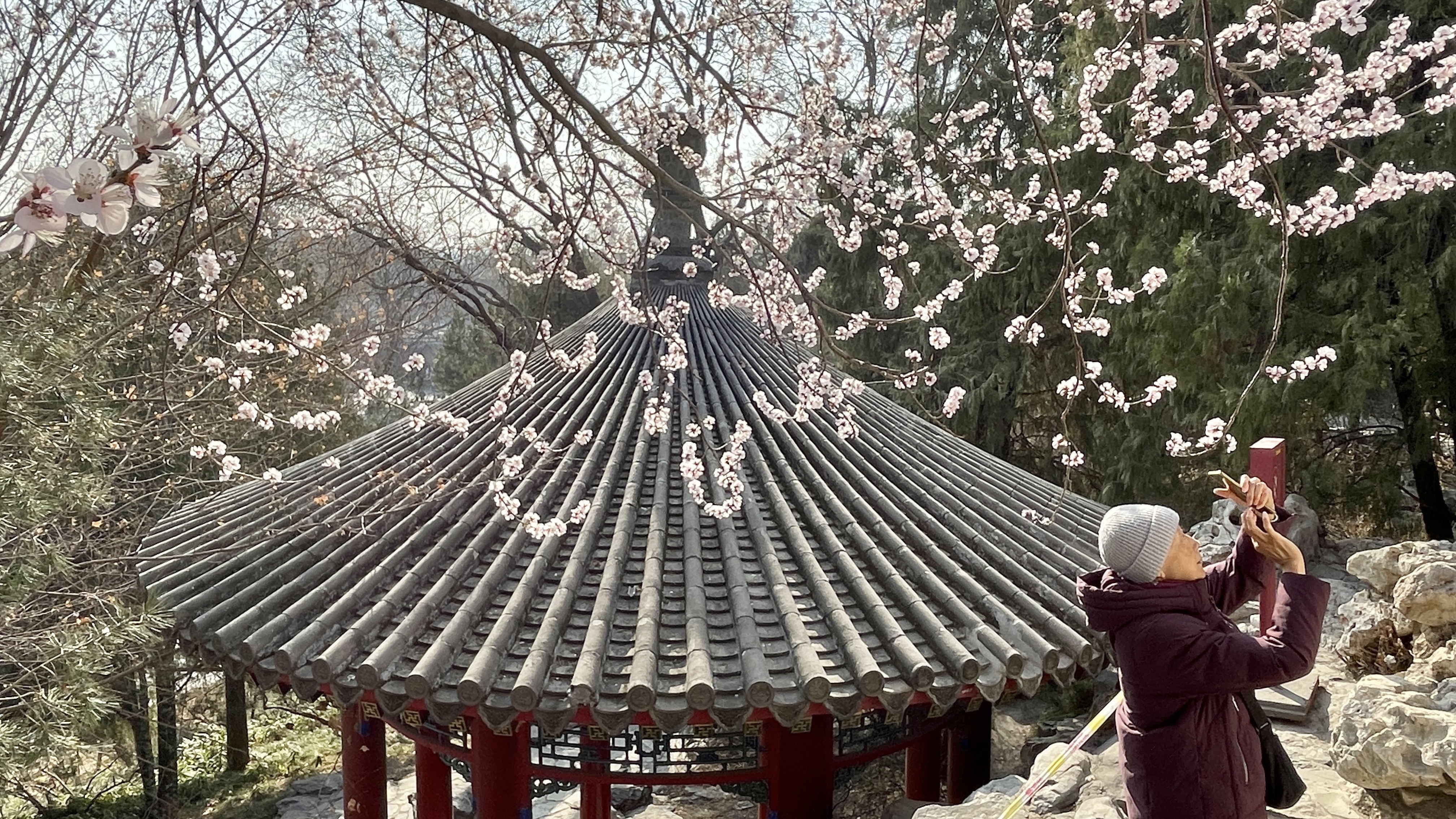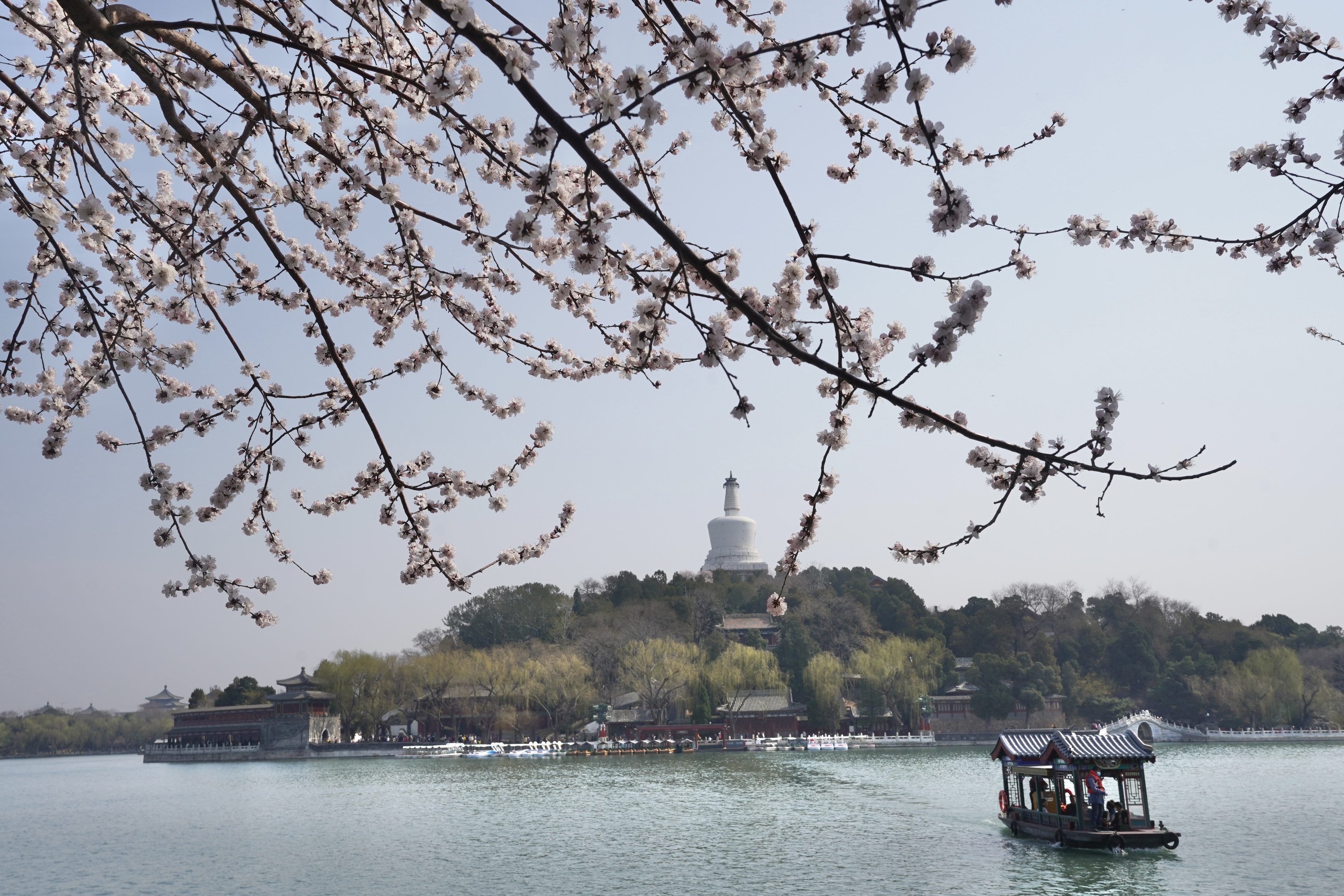 3月16日,春风轻抚,北海公园的山桃花正盛。山桃花在古建筑群中恣意地舒展着枝条,粉白的花枝在汉白玉栏杆间摇曳,与巍峨的白塔、朱红的古建相映成趣,勾勒出京城经典的“山桃映白塔”画卷。空气中弥漫着淡淡的花香,让人真切地感受到,春天已经来到这座古老的园林。