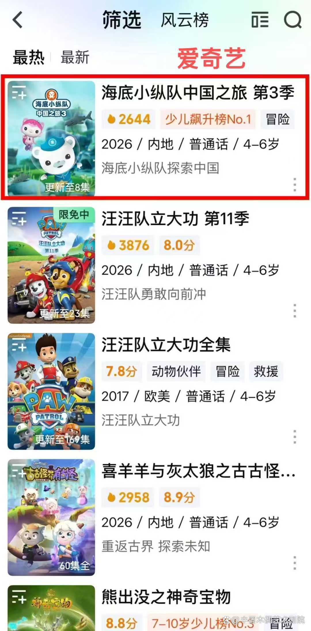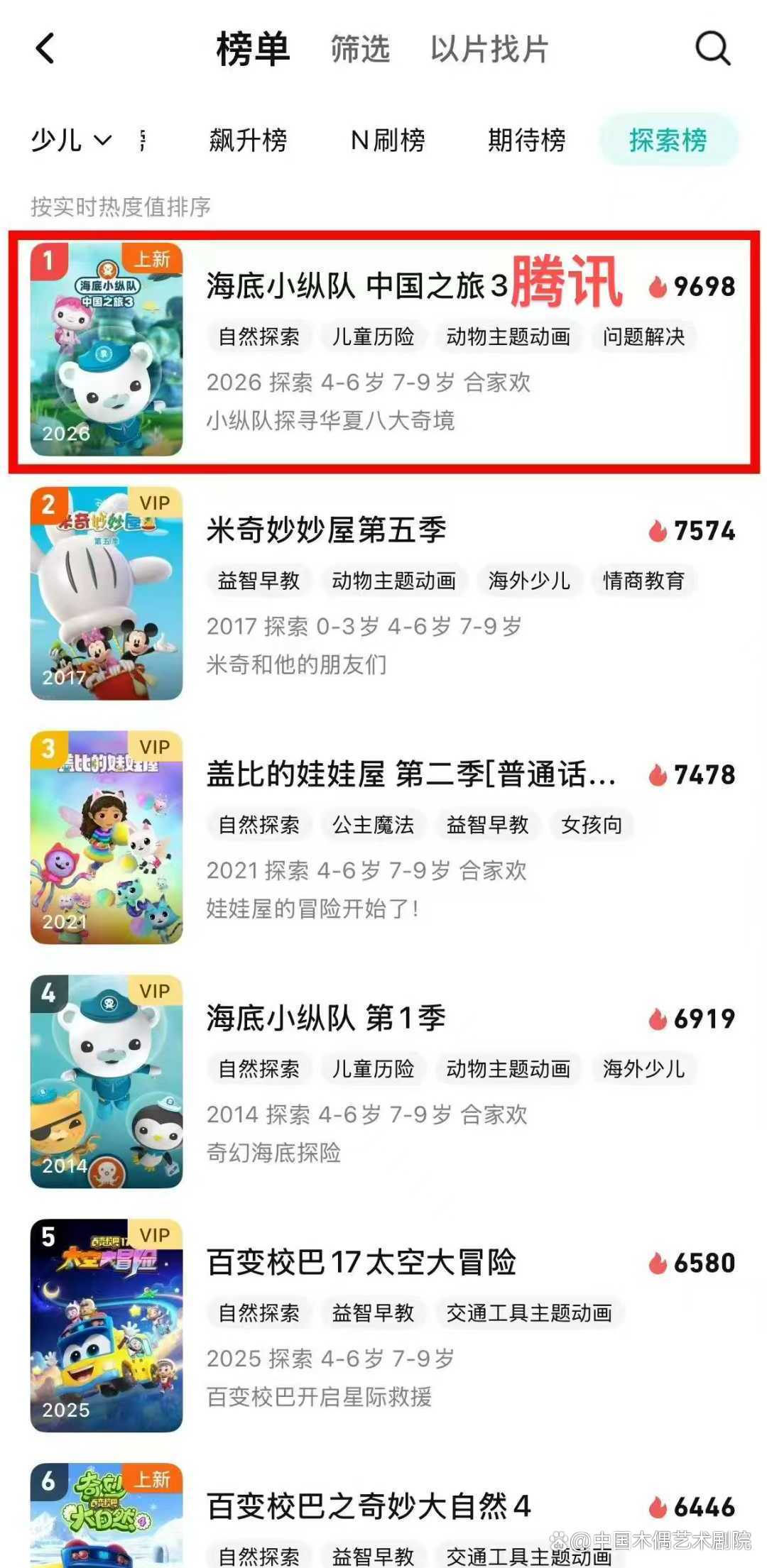 今年春节,《海底小纵队·中国之旅3》定档大年初四,我们在腾讯视频、优酷视频、爱奇艺和芒果TV,以及全国IPTV和OTT渠道与大小朋友见面,全网TOP1。熟悉的“探险、拯救、保护”初心不改,这一季,小纵队沿着中国的山河与水域继续前行,把自然与地理知识,悄悄融入每一个趣味故事里,让孩子在观剧的同时,轻松涨知识、拓眼界。