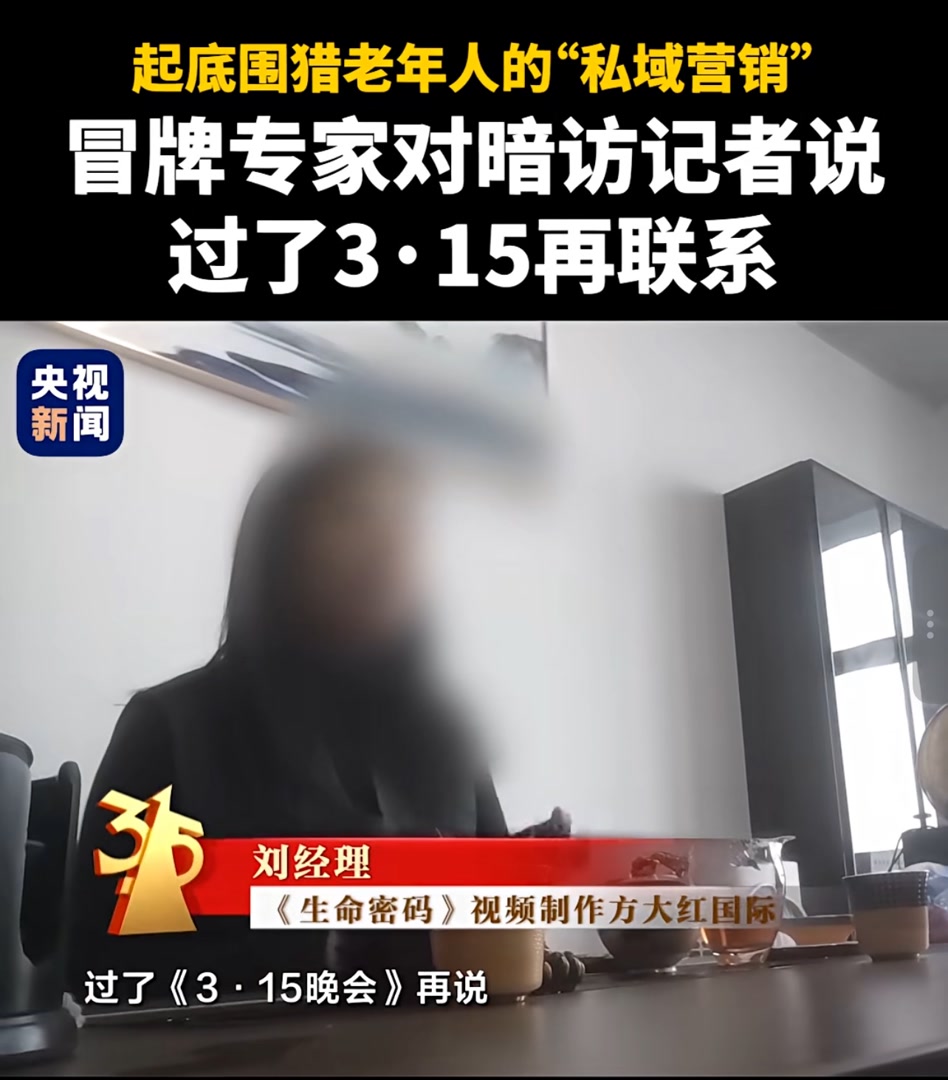 据央视财经报道,在针对私域营销围猎老年人的调查中发现,一家名叫“大红国际”的网络视频制作方将一款普通辅助治疗药品夸大成能对付白内障、高血压等多种顽疾的神药,售价是市场价的近5倍。与暗访记者交谈时,该公司刘经理“好心”传授干这一行的“安全时间”:“你们要搞就等年后,过了3·15晚会再说。今年3·15晚会什么动静、什么情况咱也不知道。3·15晚会是风向标,咱们私域渠道属于灰色地带”。
