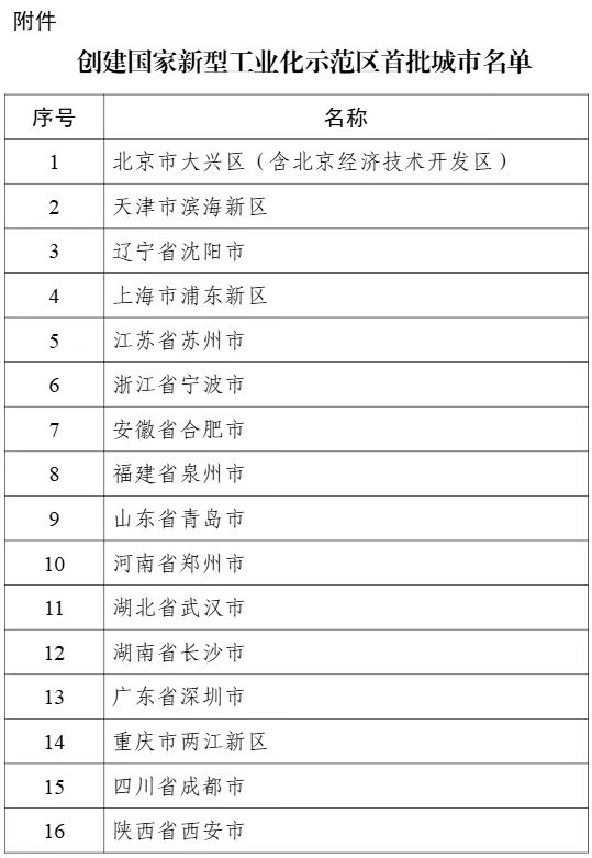 工信部确定首批16个创建国家新型工业化示范区城市,现将名单予以公布。创建城市要对照创建期工作目标,优化创建工作方案,强化组织保障,完善政策措施,确保各项示范任务落实落细,在健全产业科技创新体系、推进产业结构优化升级、推动工业数字化智能化转型、加快工业绿色低碳发展、强化优质企业梯度培育、提升产业治理现代化水平等方面,形成一批具有示范性、引领性的重大成果,为推动新型工业化发挥引领辐射带动作用。