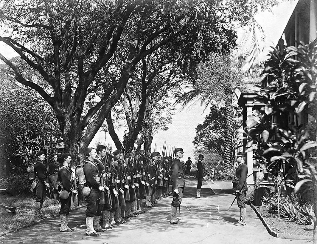 傍晚时分,162名全副武装的美国士兵,出现在平静的檀香山街头。每个士兵都带着来复枪,挎着子弹带,炮兵则拉着加特林机关枪和小型加农炮。