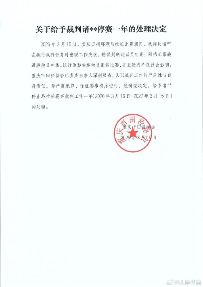 3月15日,2026重庆万州环湖马拉松赛事现场出现裁判工作失误。男子全马冠军选手盛雪李在冲线前遭现场裁判错误拦截推搡,这一事件引发全网热议。3月16日,重庆市田径协会发布官方处罚公告,对涉事裁判作出停止马拉松赛事裁判工作一年的处罚,禁赛期限自2026年3月16日起至2027年3月15日止。