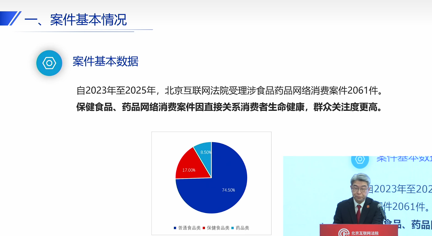 2023年至2025年,北京互联网法院审理涉食品药品网络消费案件2061件。其中,普通食品类案件1536件,保健食品类案件351件,药品类案件174件,分别占比74.5%、17.0%、8.5%。老年人纠纷案件呈逐年上升趋势,在保健食品、药品消费领域的占比尤为突出。