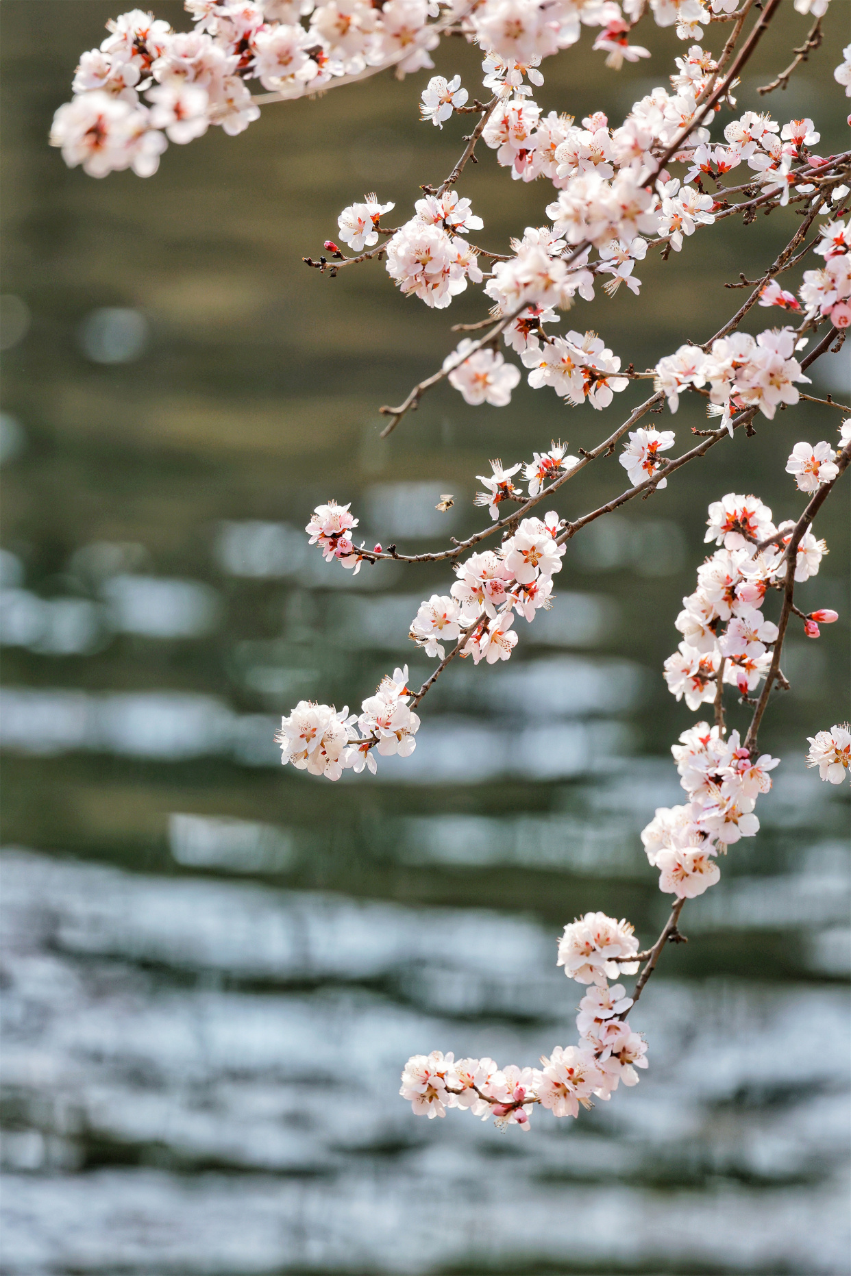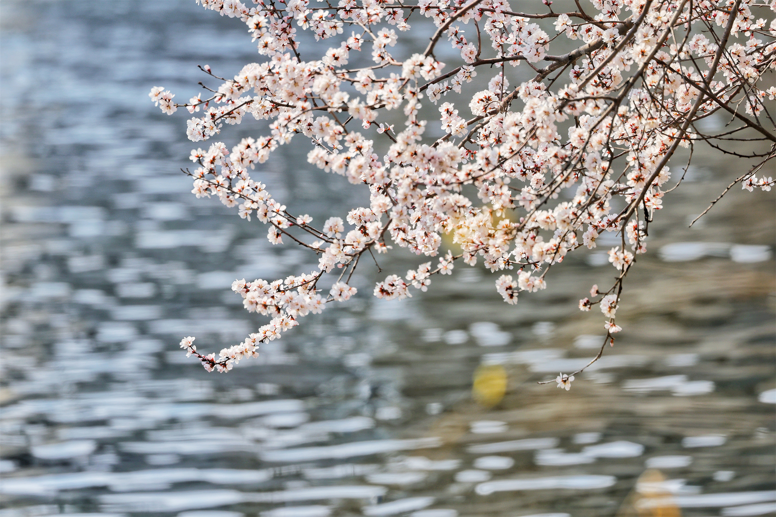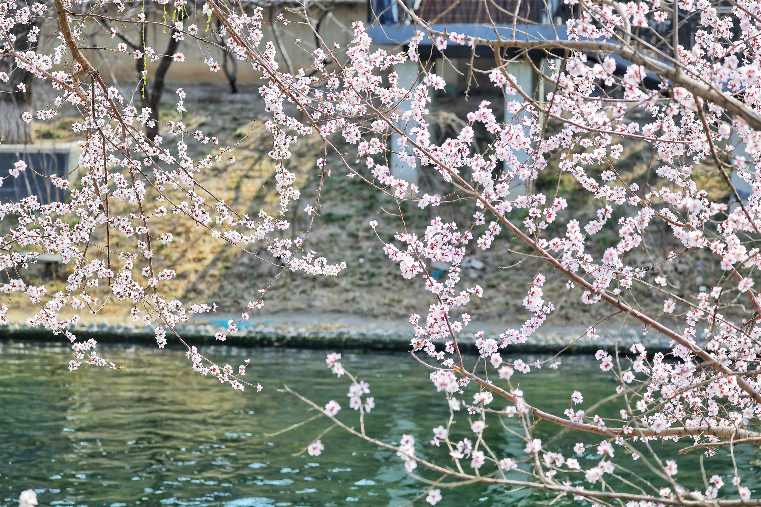 两岸山桃正值盛时,粉白花朵临水垂枝,自成风韵。