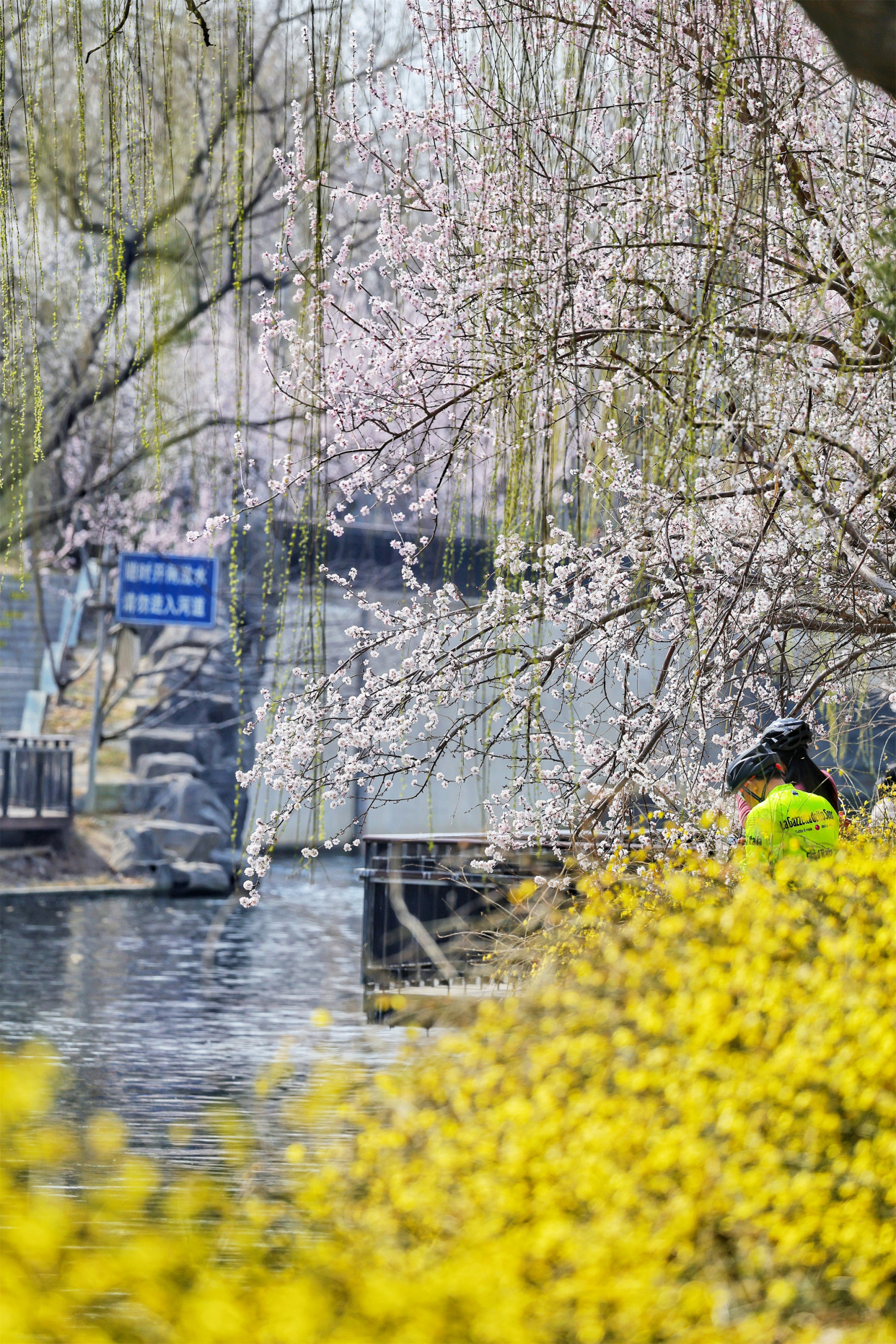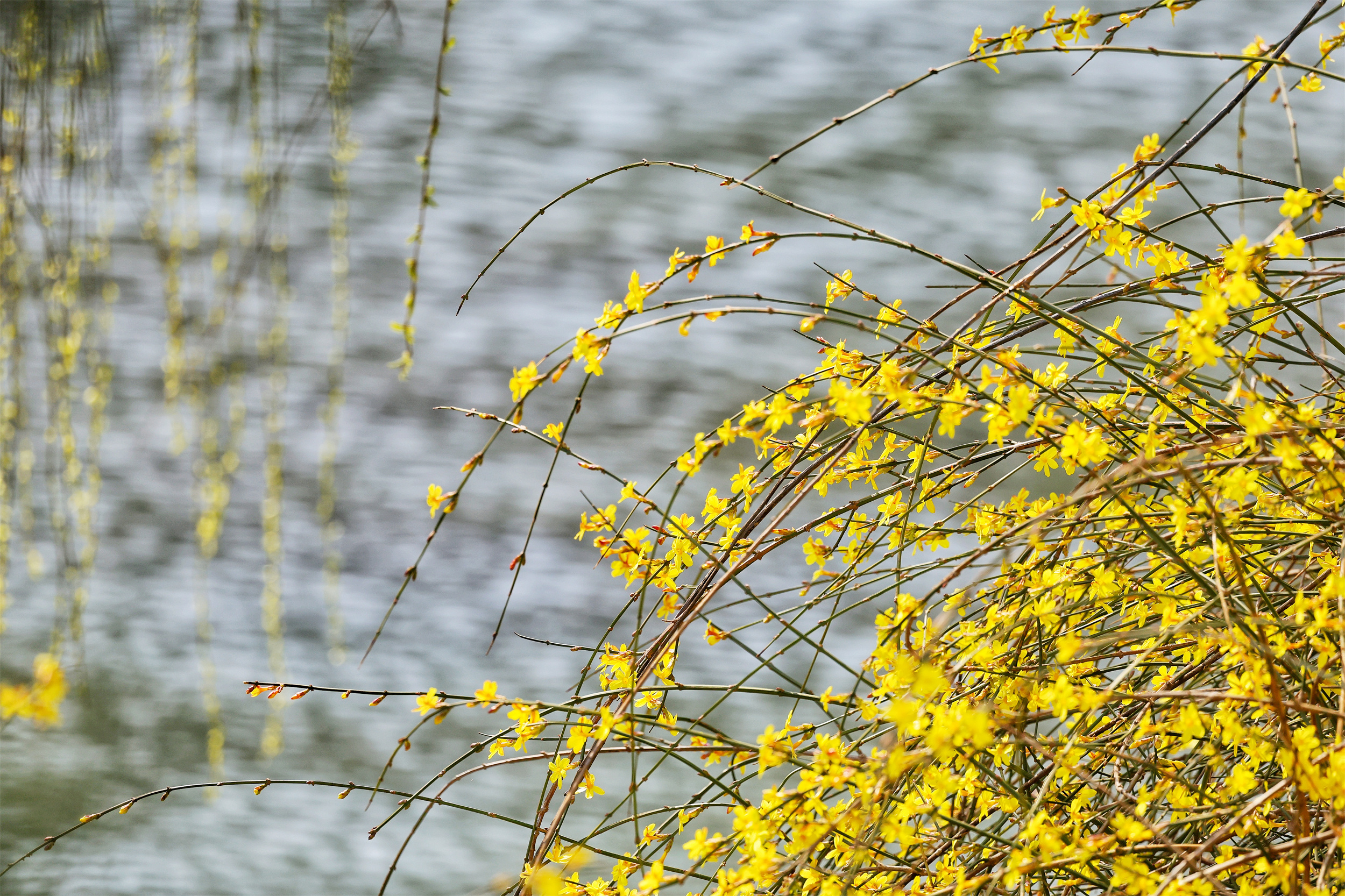 步道旁,迎春最先感知暖意,用一簇簇明黄点亮枝头。