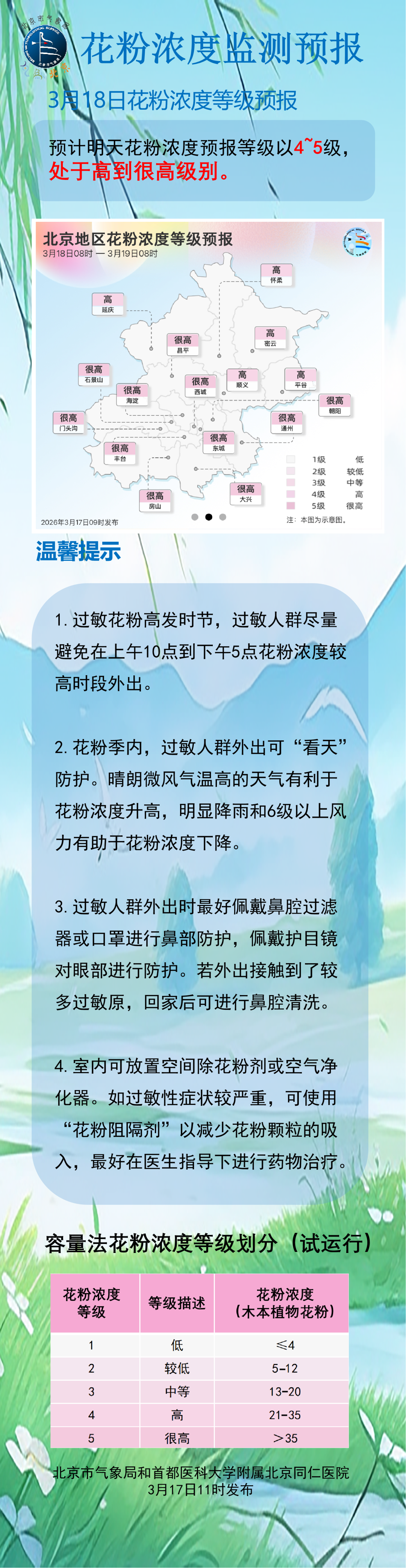 预计3月17日花粉浓度以4-5级为主,为高到很高级别(21-50粒/立方米)。