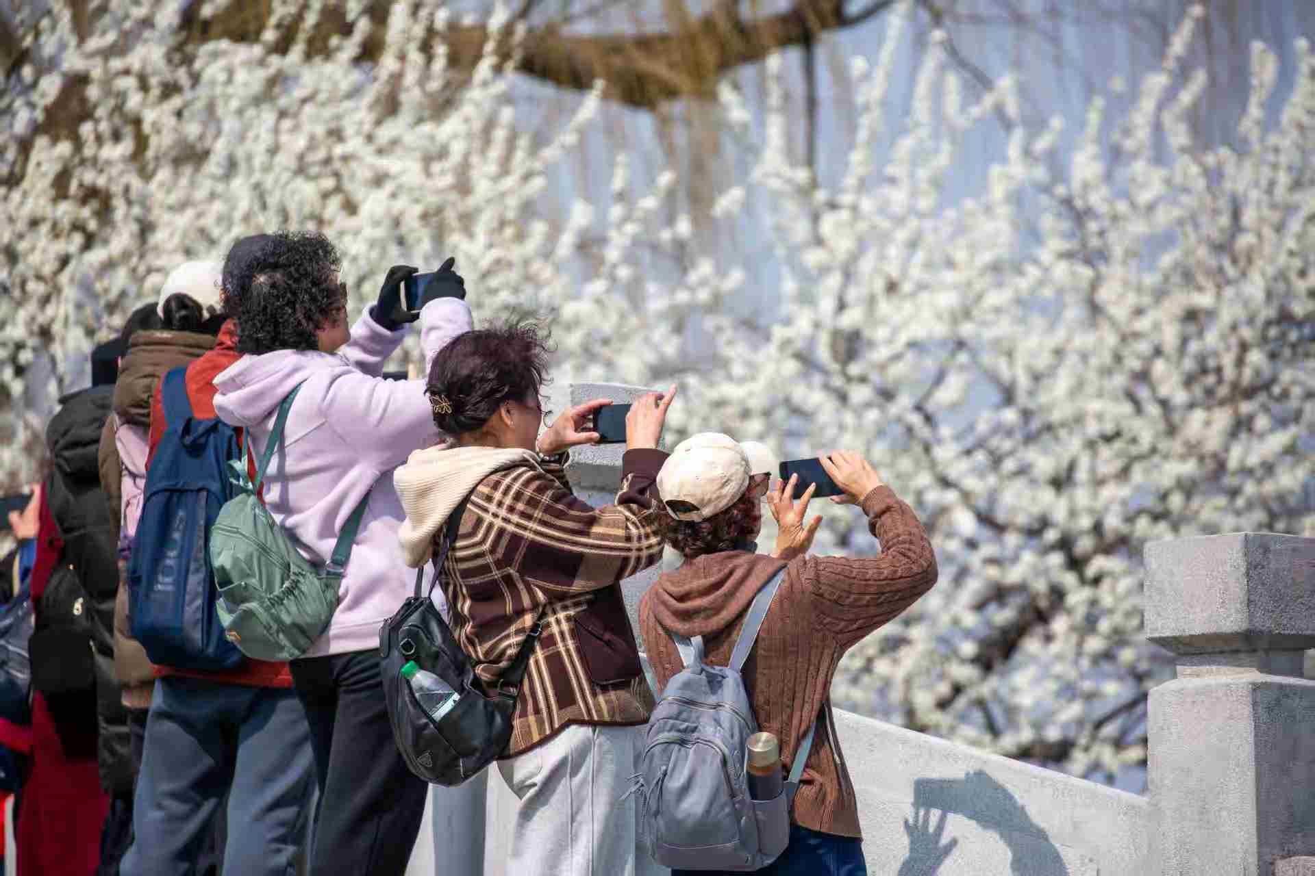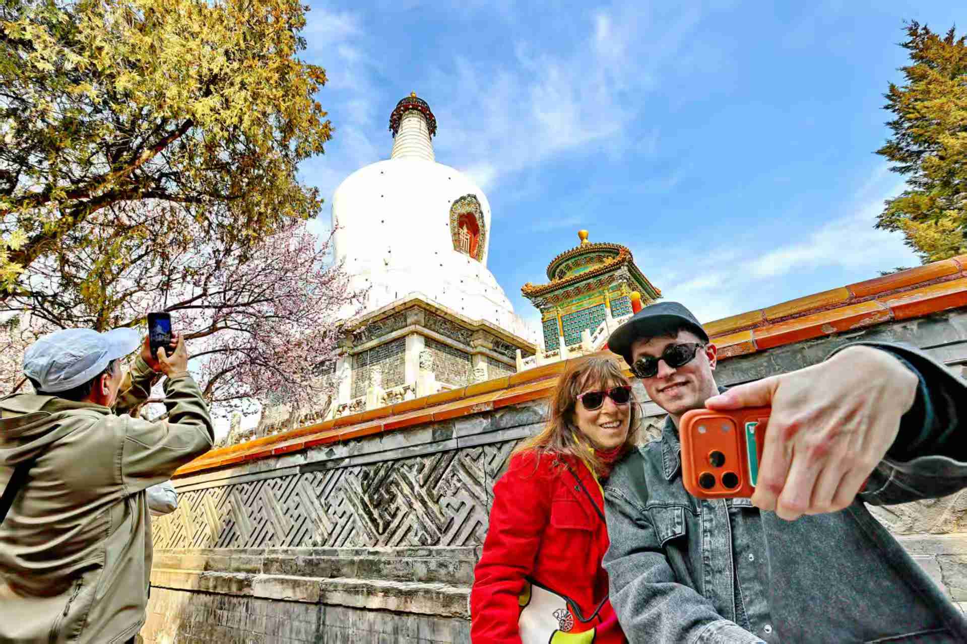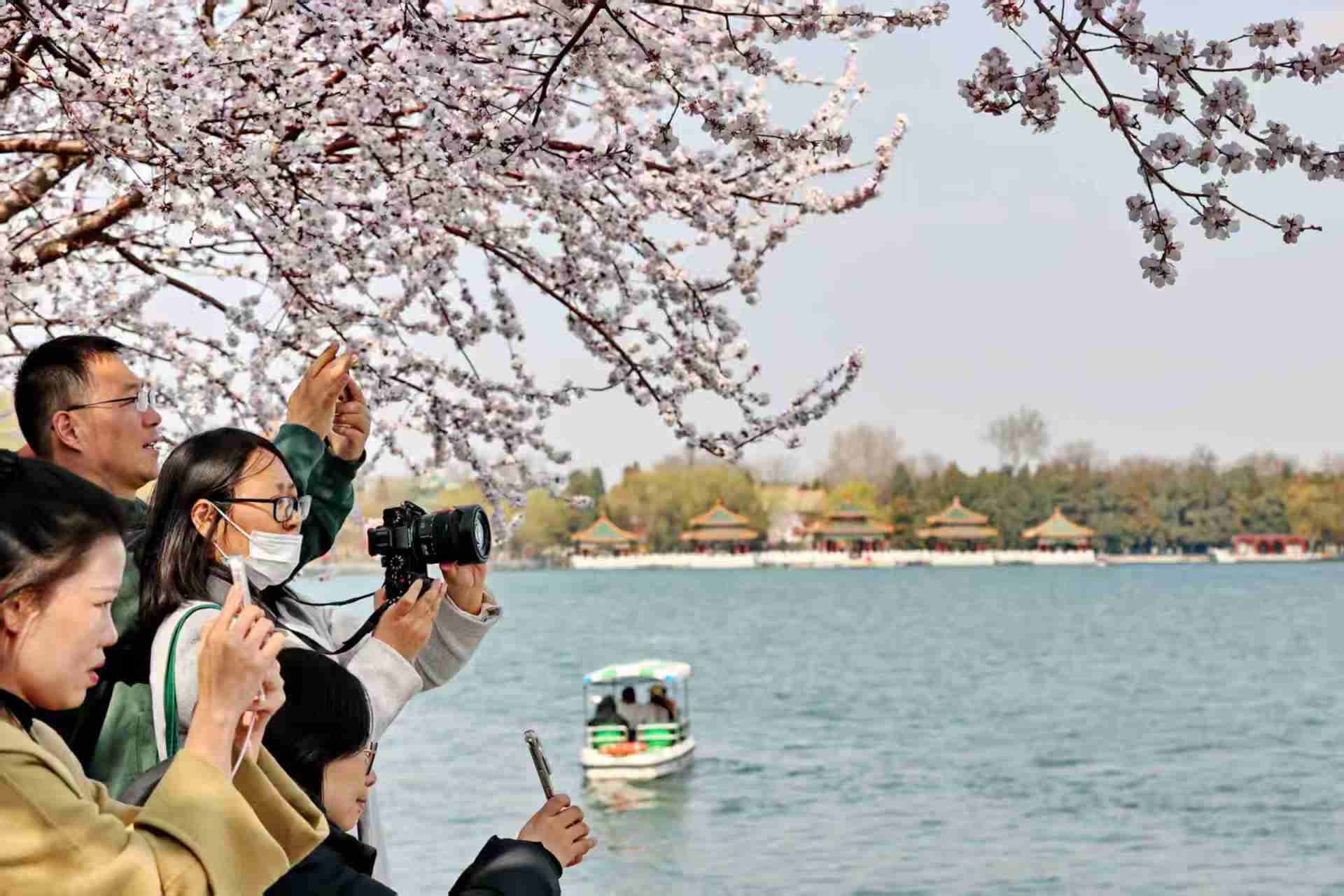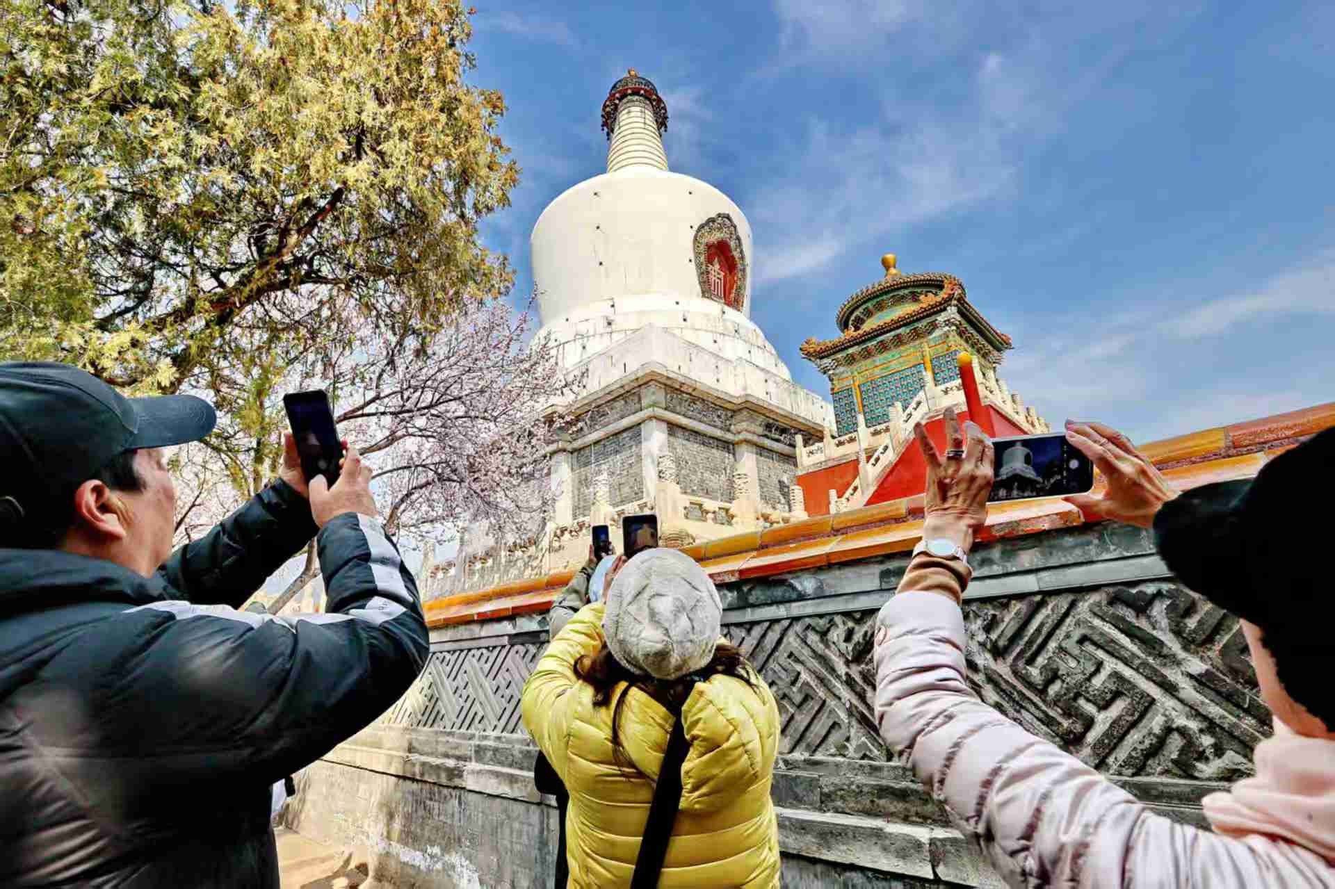 北京北海公园春花进入盛花期,吸引众多市民游客前来打卡、拍照留影。