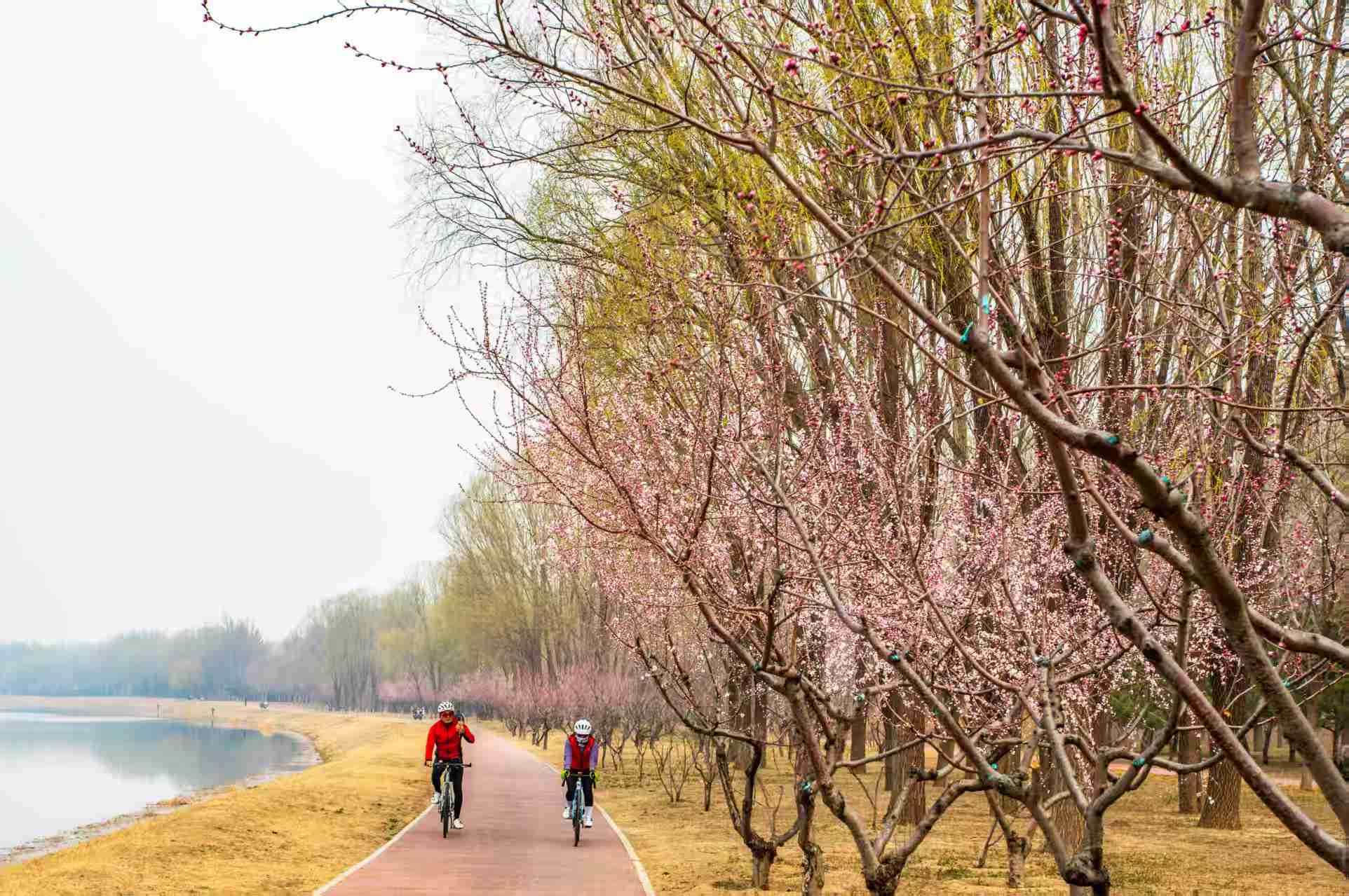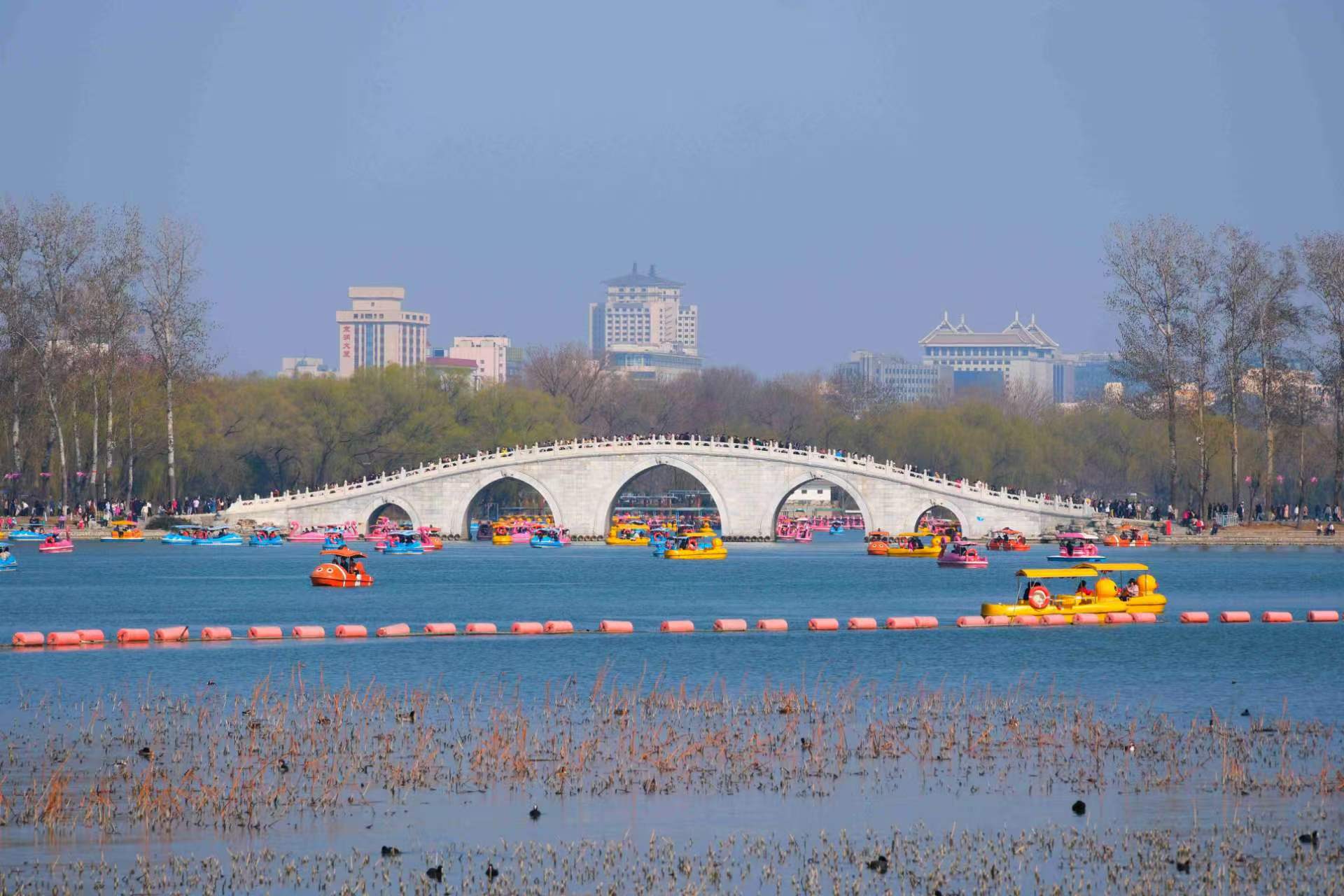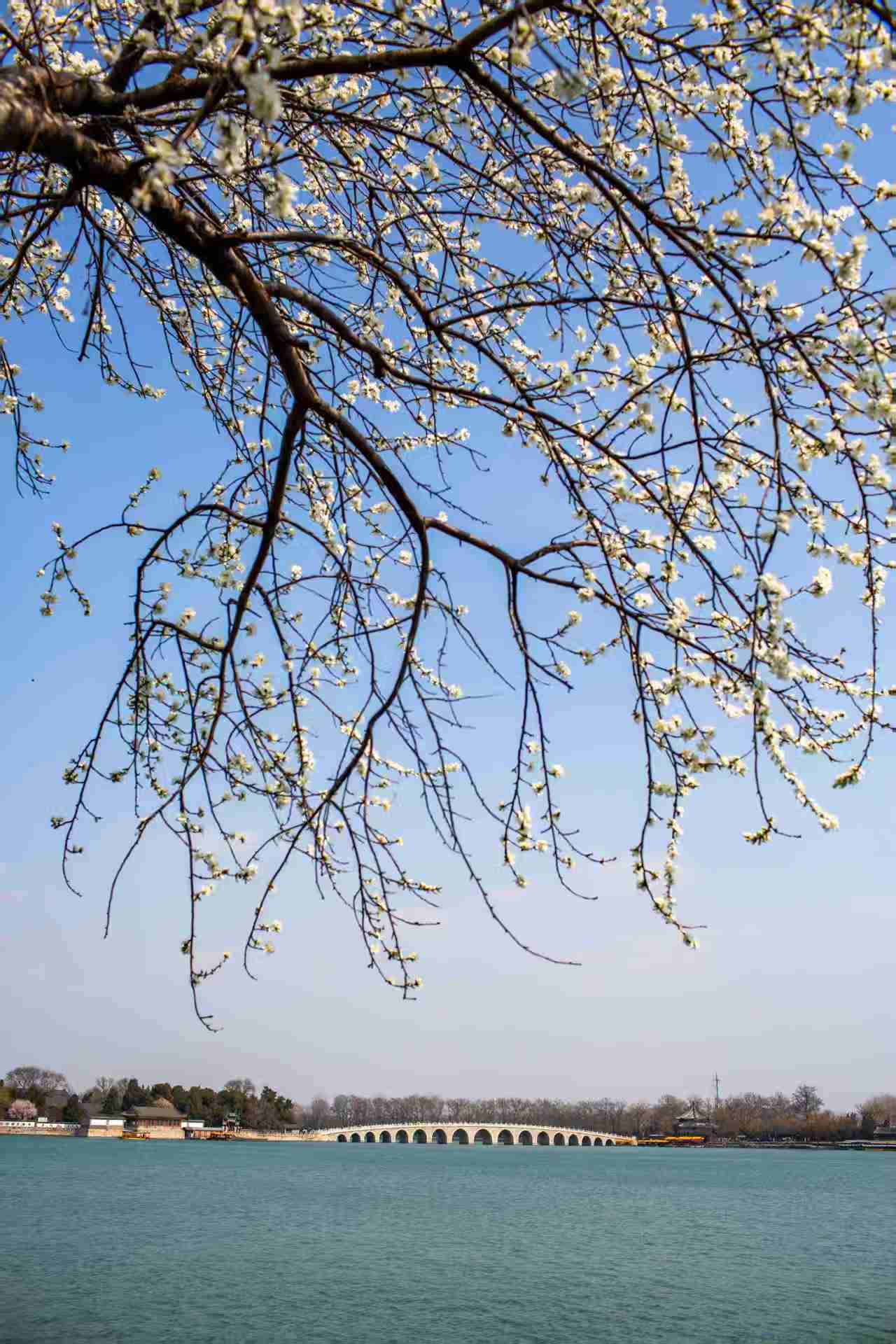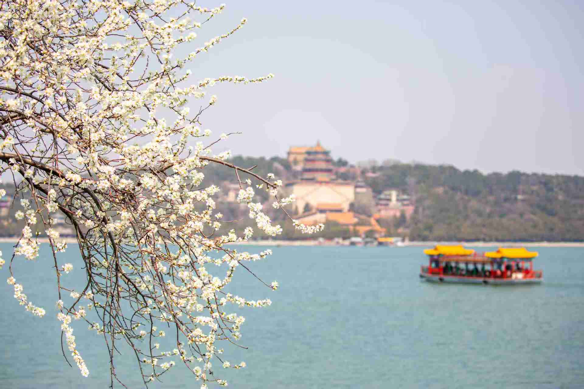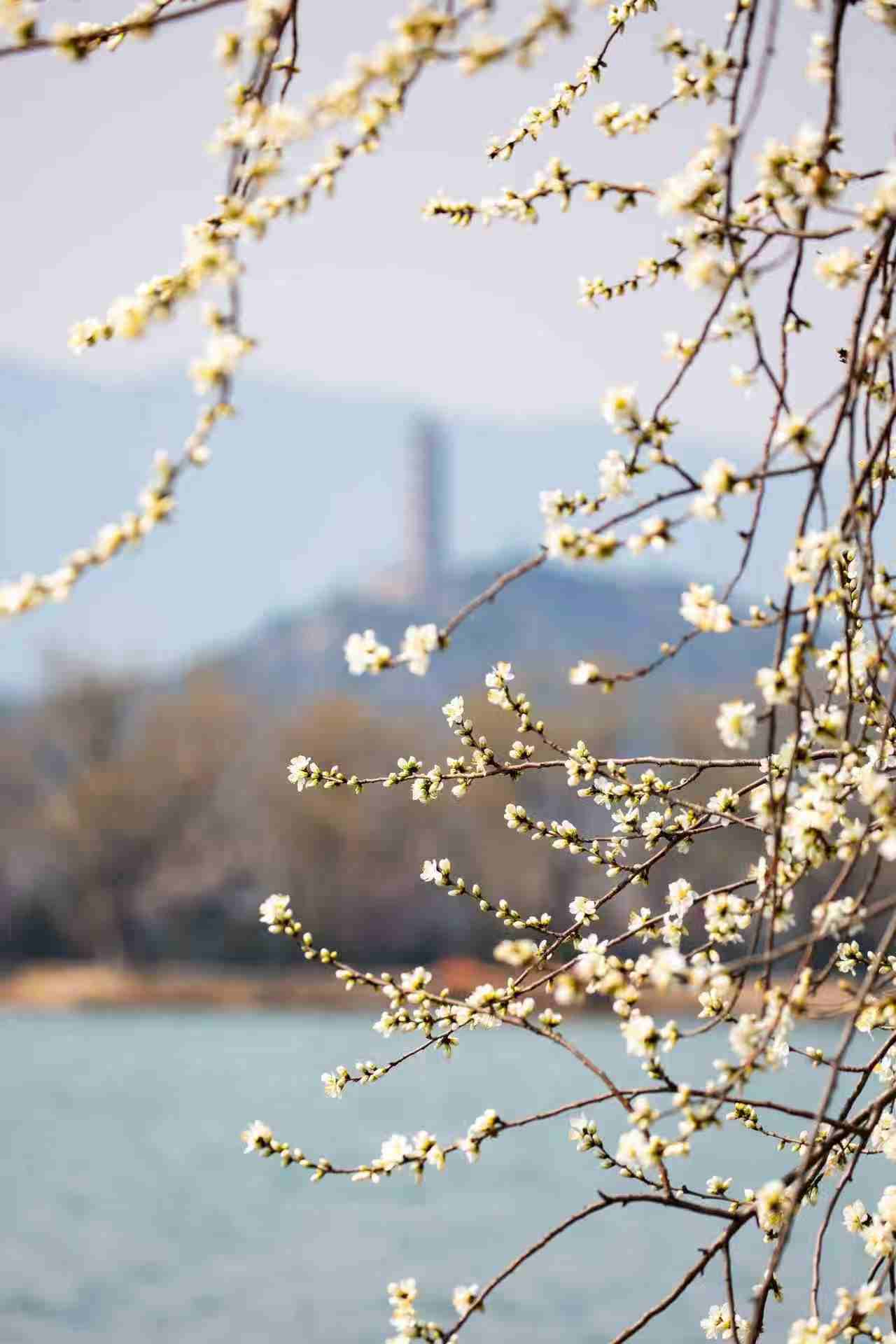 北京北海公园春花进入盛花期,吸引众多市民游客前来打卡、拍照留影。
