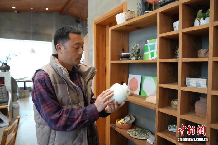 3月15日,艺术家巩孝来展示在崔岗艺术村制作的手工艺品。中新社记者 张俊 摄