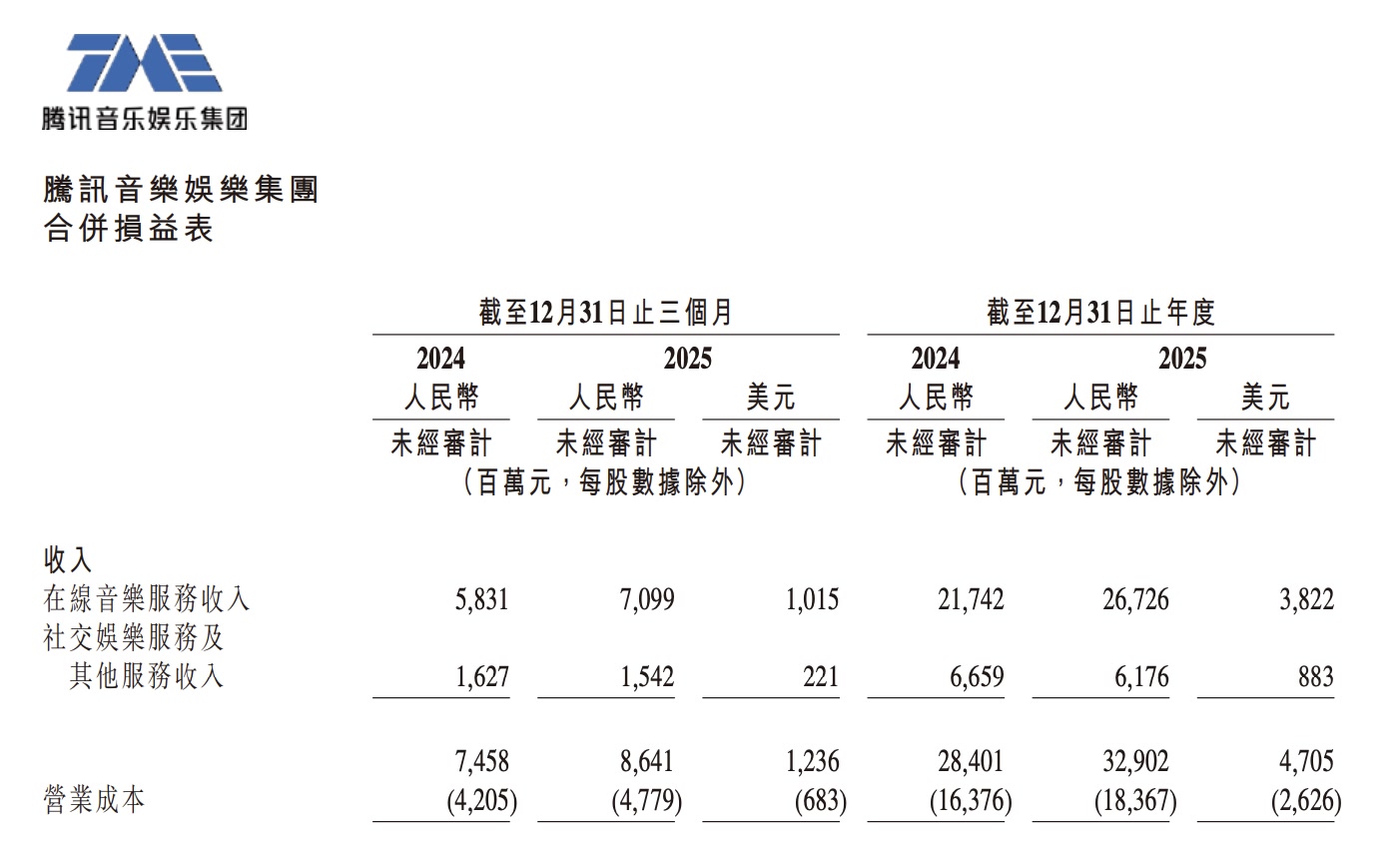 在线音乐行业的竞争正从单纯的“圈地”转向比拼“内功”。3月17日,腾讯音乐娱乐集团发布2025年全年及第四季度财报。财报显示,2025年腾讯音乐总收入329.0亿元,同比增长15.8%,调整后净利润99.2亿元,同比增长22.0%。第四季度总收入86.4亿元,同比增长15.9%,调整后净利润25.8亿元,同比增长7.6%。全年毛利率从2024年的42.3%提升至44.2%。