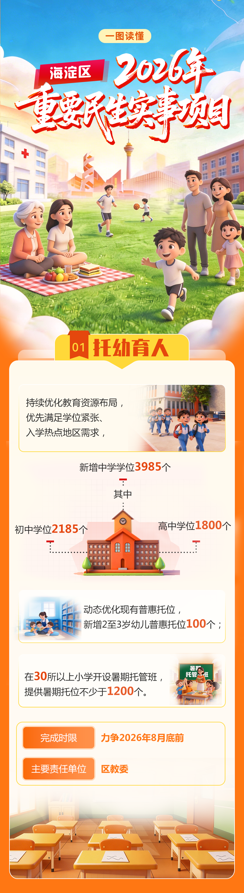 持续优化教育资源布局,优先满足学位紧张、入学热点地区需求,新增中学学位3985个,其中初中学位2185个、高中学位1800个;动态优化现有普惠托位,新增2至3岁幼儿普惠托位100个;在30所以上小学开设暑期托管班,提供暑期托位不少于1200个。