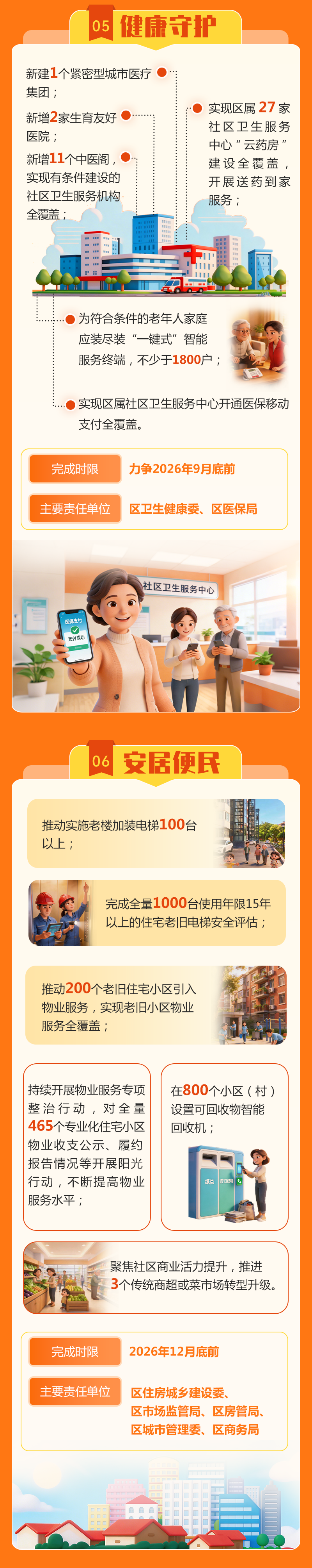 推动实施老楼加装电梯100台以上;完成全量1000台使用年限15年以上的住宅老旧电梯安全评估;推动200个老旧住宅小区引入物业服务,实现老旧小区物业服务全覆盖;持续开展物业服务专项整治行动,对全量465个专业化住宅小区物业收支公示、履约报告情况等开展阳光行动,不断提高物业服务水平;在800个小区(村)设置可回收物智能回收机;聚焦社区商业活力提升,推进3个传统商超或菜市场转型升级。