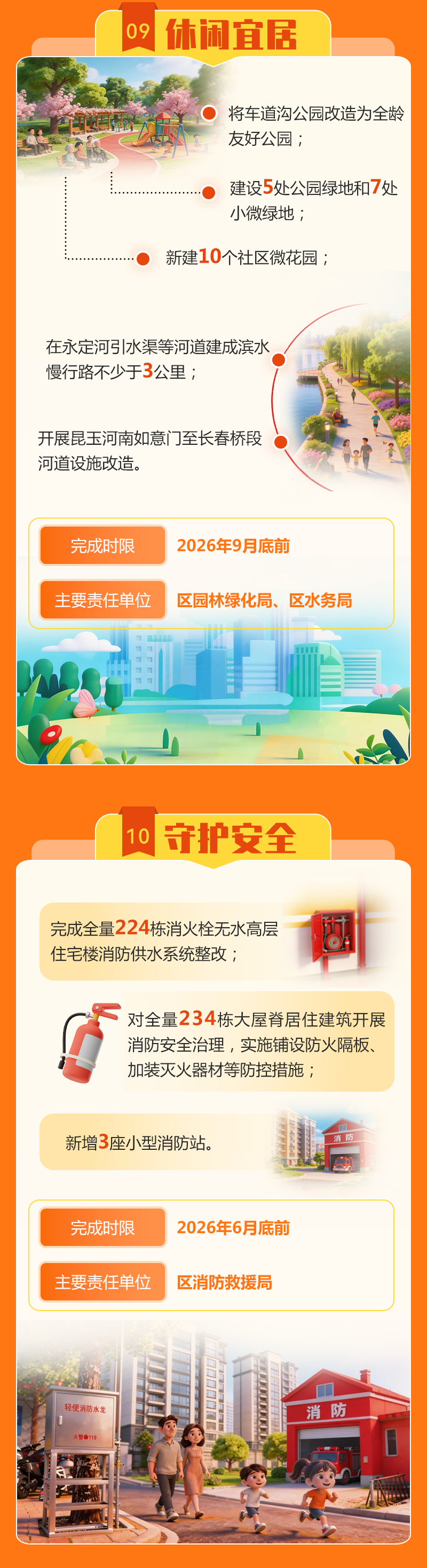 将车道沟公园改造为全龄友好公园;建设5处公园绿地和7处小微绿地;新建10个社区微花园;在永定河引水渠等河道建成滨水慢行路不少于3公里;开展昆玉河南如意门至长春桥段河道设施改造。