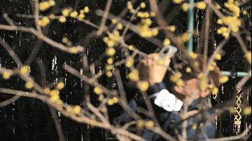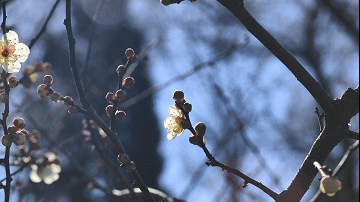 除了蜡梅,耕织图景区的春花正在次第苏醒:路边石隙里,迎春花已经绽放出点点金黄;山桃的花苞饱满圆润,粉粉嫩嫩,只待周末气温回升,便将迎来盛放。
