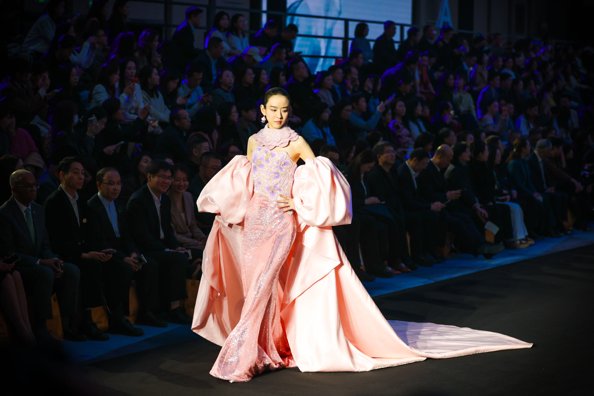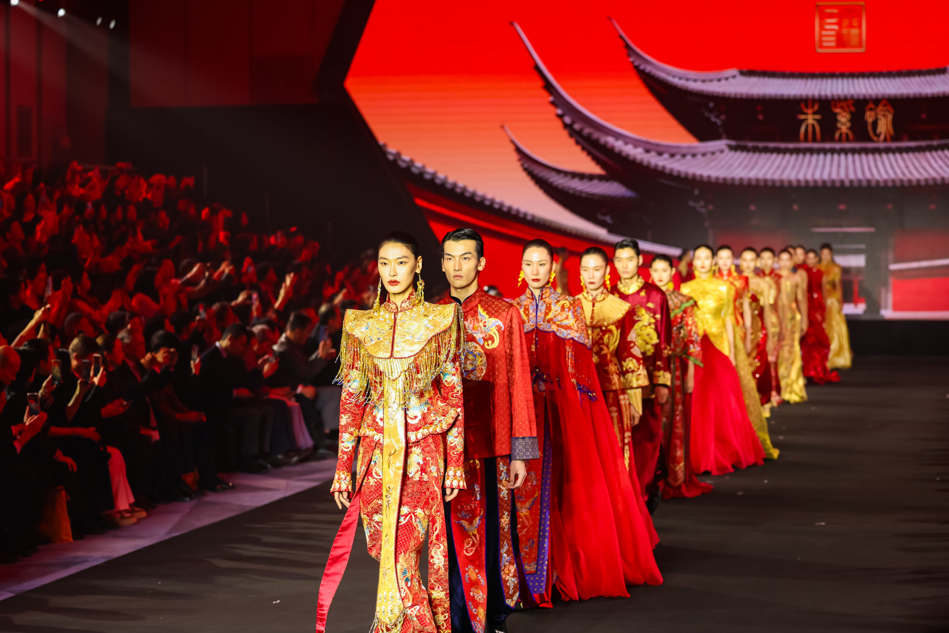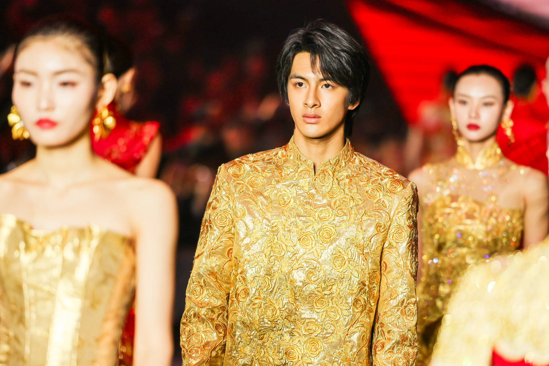 伴随着动感的鼓点,光影交织间,身着极具古典美学风格华服的模特登上T台。白、绿、青、蓝、紫等色泽的服装上,或点缀亮片宝石、或刺绣传统纹样、或以纱幔轻裹,美感十足。记者了解到,这场开幕大秀的主题为“华服双章”,由尚仄国际携旗下“六礼”与“朱紫褕”服装品牌呈现,共计80套服装在模特的演绎下,完成了一场中华服章之美的创新表达。