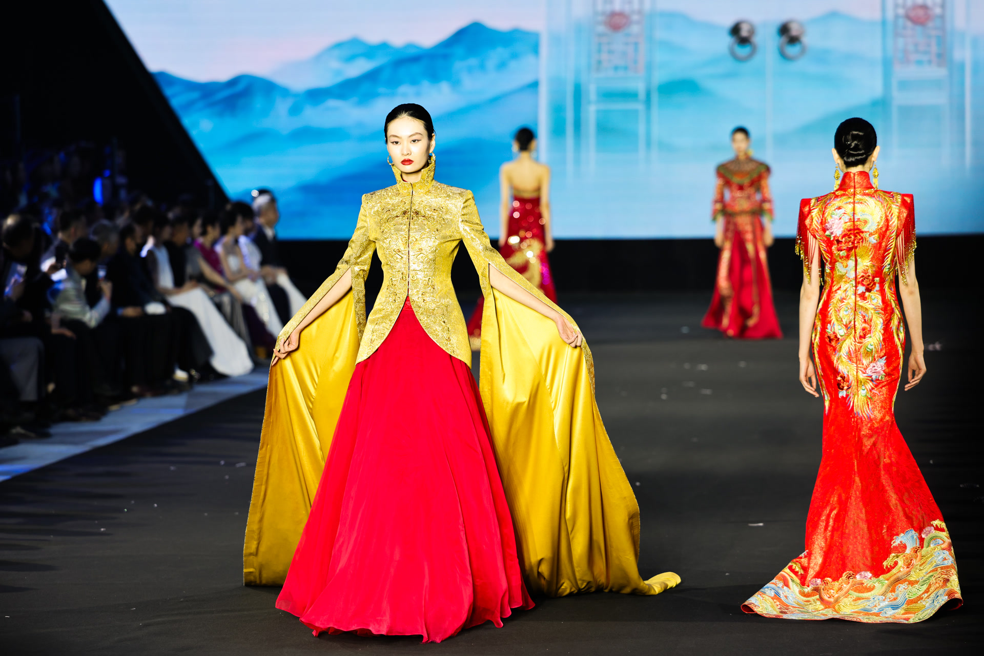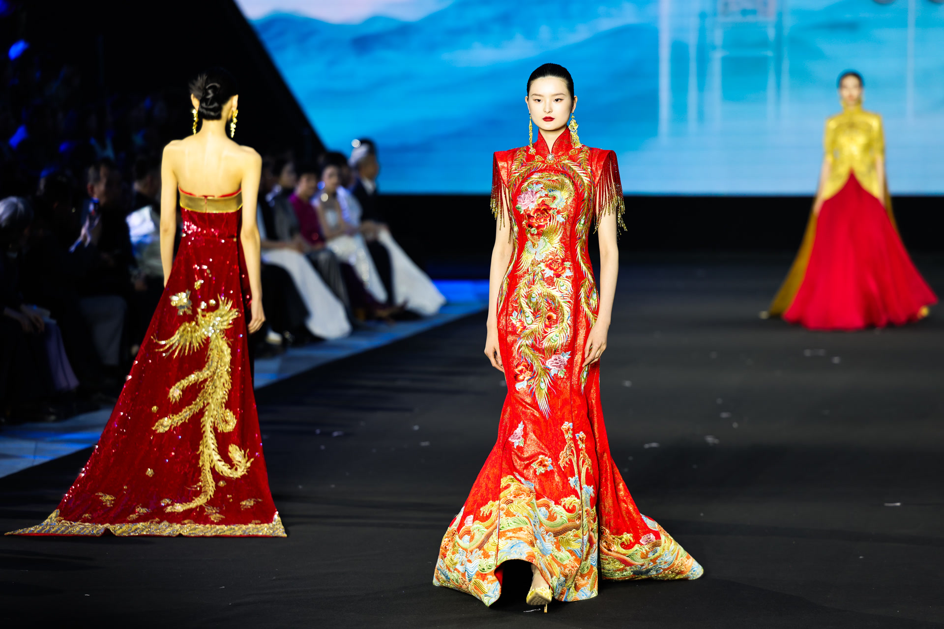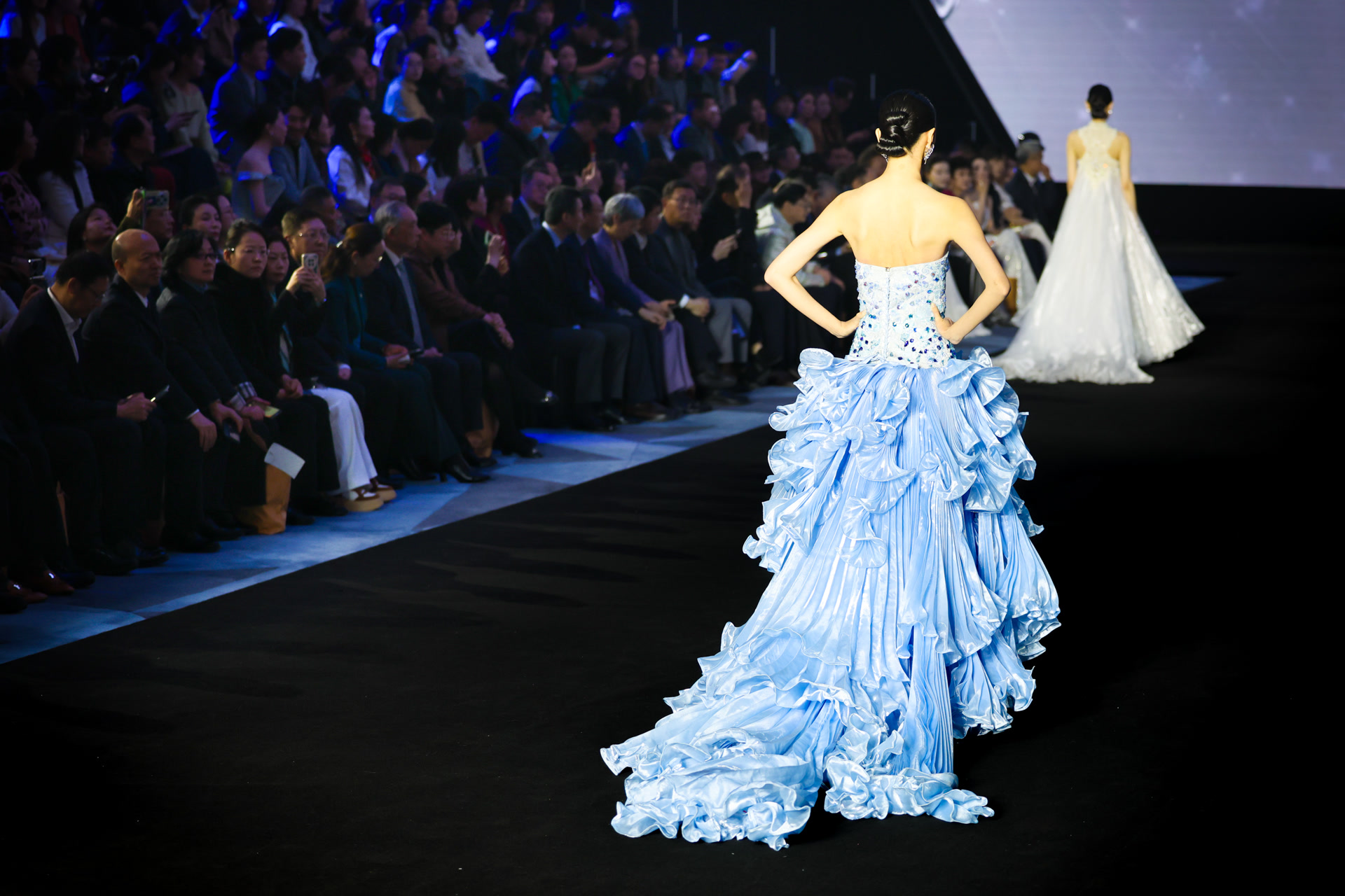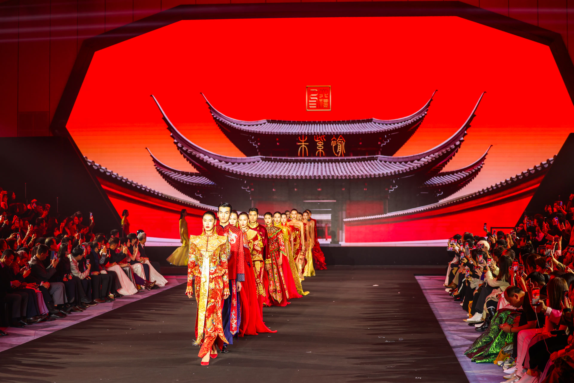 伴随着动感的鼓点,光影交织间,身着极具古典美学风格华服的模特登上T台。白、绿、青、蓝、紫等色泽的服装上,或点缀亮片宝石、或刺绣传统纹样、或以纱幔轻裹,美感十足。记者了解到,这场开幕大秀的主题为“华服双章”,由尚仄国际携旗下“六礼”与“朱紫褕”服装品牌呈现,共计80套服装在模特的演绎下,完成了一场中华服章之美的创新表达。