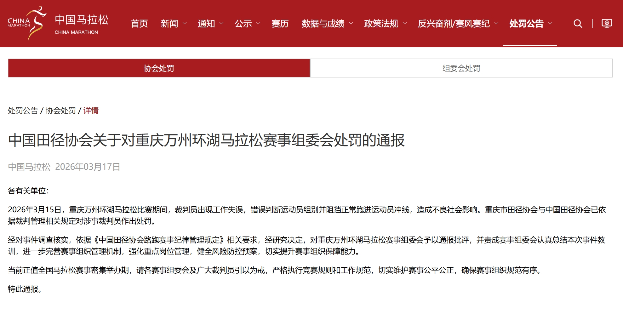 3月17日,中国马拉松官方网站发布《中国田径协会关于对重庆万州环湖马拉松赛事组委会处罚的通报》:
