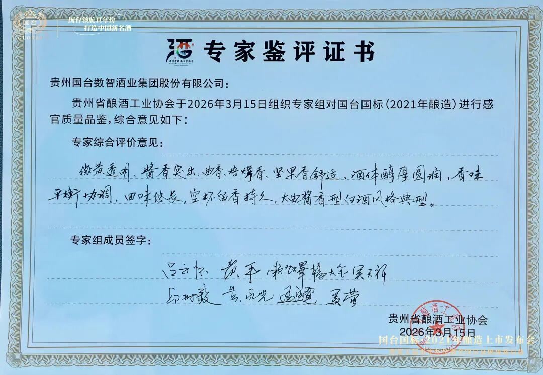 两份专家鉴评意见如下:国台国标·2021年酿造酒体微黄透明,酱香突出,曲香、焙烤香、坚果香舒适,酒体醇厚圆润,香味平衡协调,回味悠长,空杯留香持久,大曲酱香型白酒典型风格。国台国标(2012—2020年酿造)随着酒龄增长,酒体微黄透明,酱香突出,老酒香明显舒适。随着生产时间的变化,酒体更醇厚、更丰满、更协调,老酒味逐年增强,回味悠长,空杯留香持久,大曲酱香型白酒风格典型。国台国标酒质量逐年稳定提升。