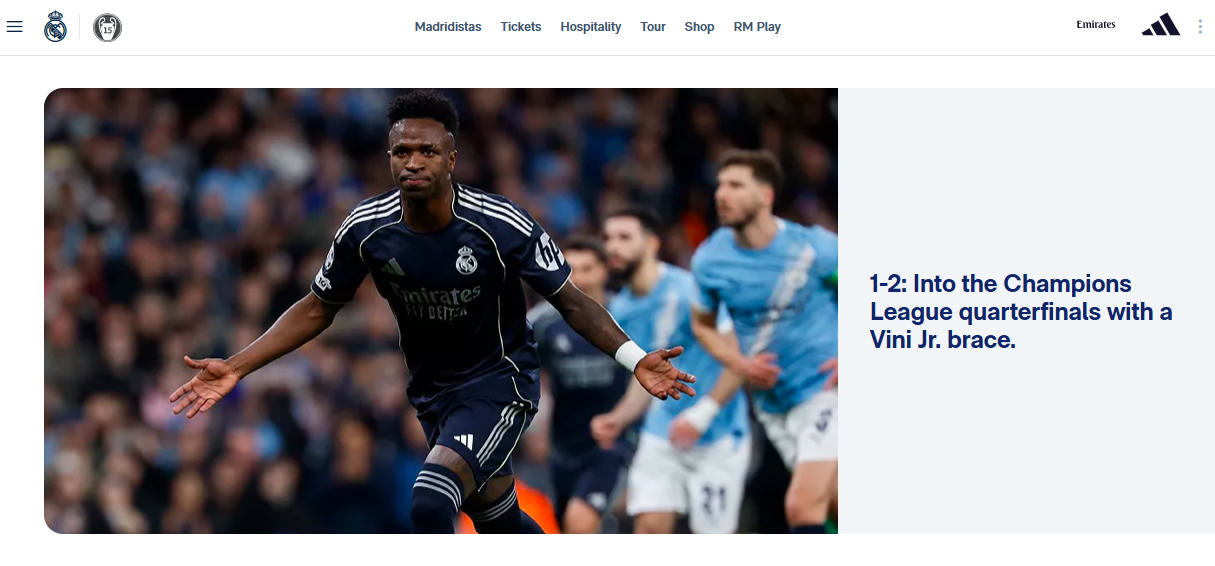 这是皇马与曼城连续第五年在欧冠淘汰赛遭遇,“银河战舰”已经连续第三年笑到最后。皇马主帅阿韦洛亚赛后表示,能在客场击败曼城这样的强队真的非常开心,他说:“皇马与曼城现在已经成为一组经典对决,他们拥有出色的队员和一位伟大的教练。从一开始我们就知道比赛会非常艰难,必须拼尽全力才有机会取胜。”