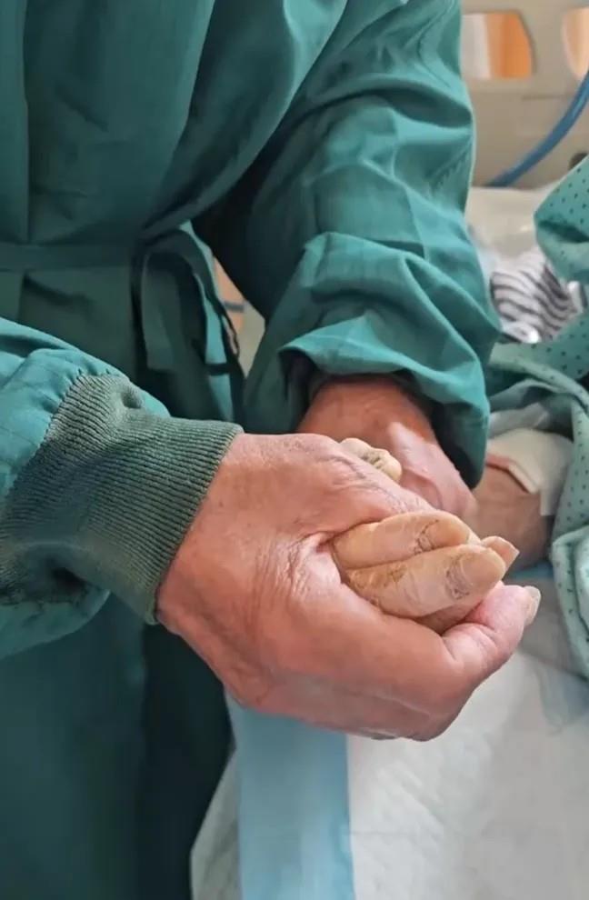 近日,在浙江宁波市医疗中心李惠利医院东部院区ICU(重症监护室)住院多日的薛阿姨因病过世,老伴陈阿重老伯抹着眼泪紧紧握住老伴的手不愿松开,嘴里呢喃着做最后的道别。