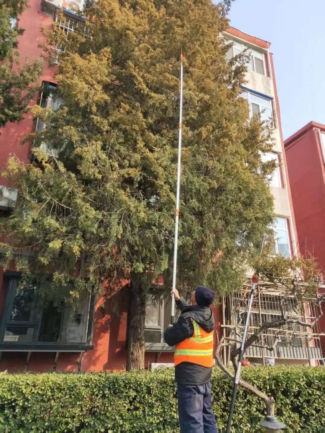 今年春季来临前,园林绿化工人已使用高枝剪刀对圆柏雄球花开展专项修剪工作,从源头削减花粉产量。在修剪基础上,园林部门启用雾炮车开展洒水喷淋、地面湿化作业,通过水雾裹挟花粉加速其沉降,有效降低局部区域的花粉浓度,为市民营造更舒适的户外环境。
