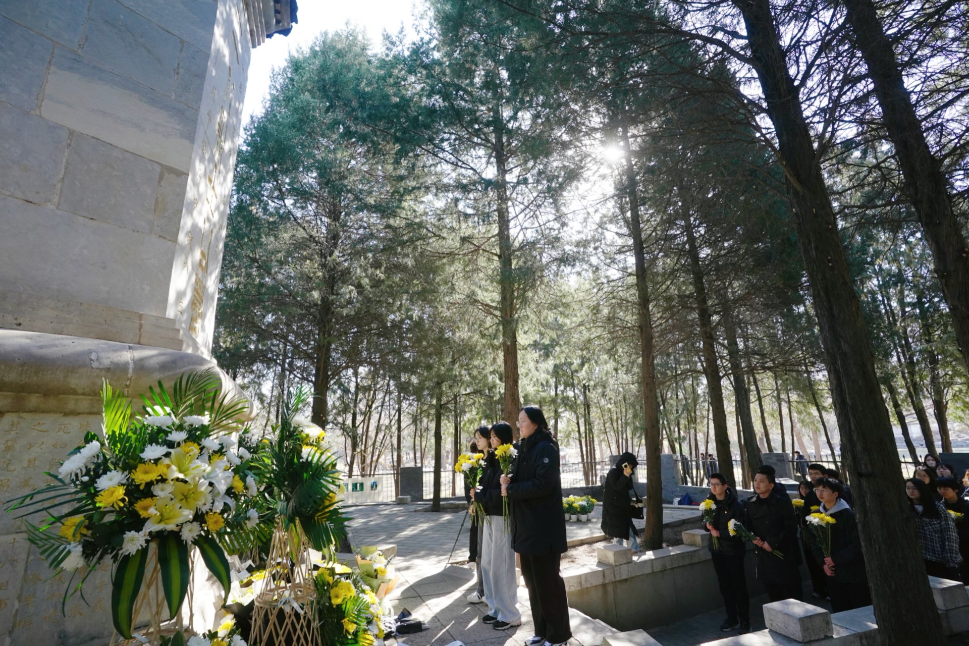 宣讲结束,大家依次上前,敬献鲜花、整理缎带,深情鞠躬致敬。一朵朵白菊轻放在碑前,花瓣在春风中微微颤动。