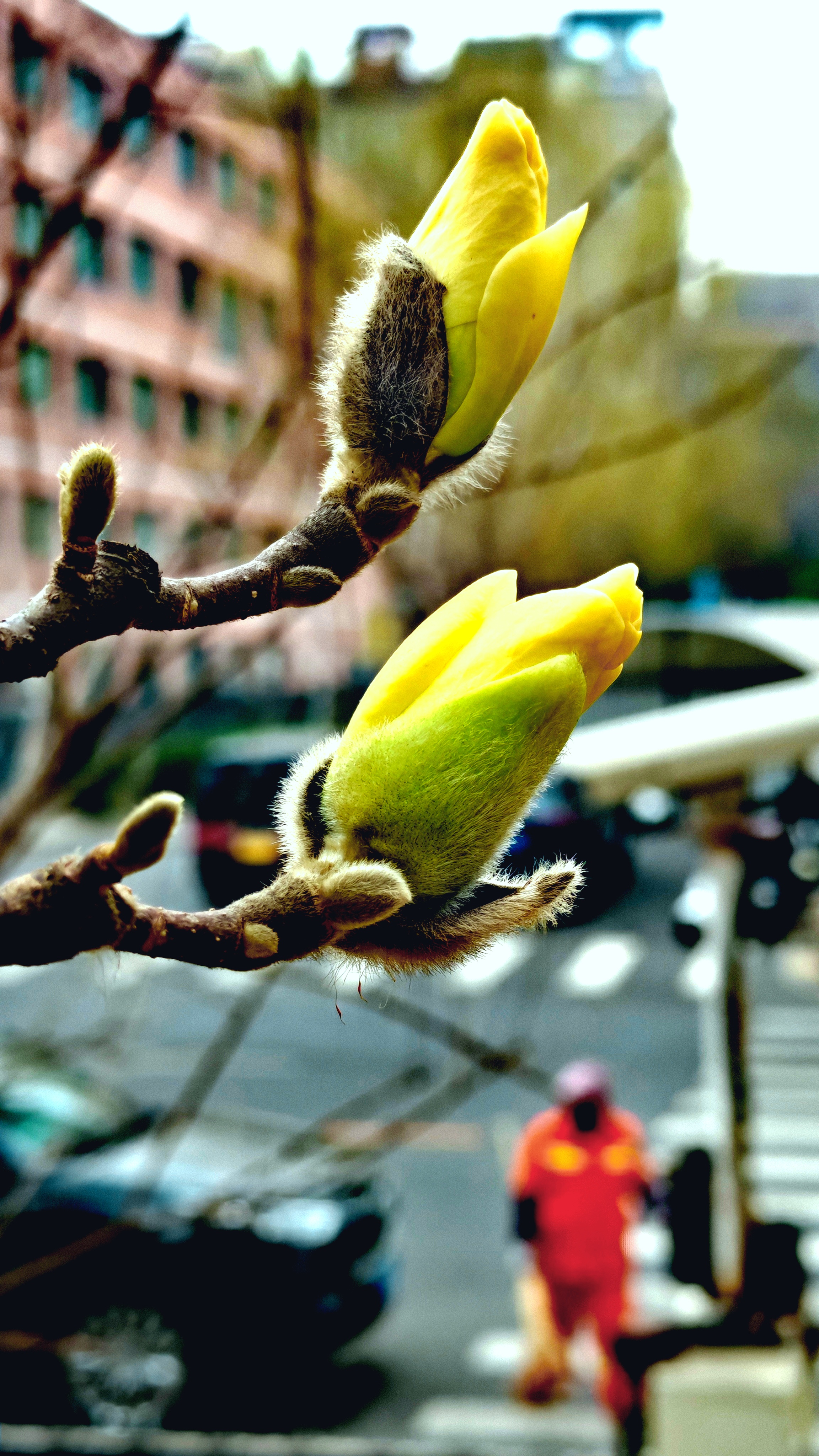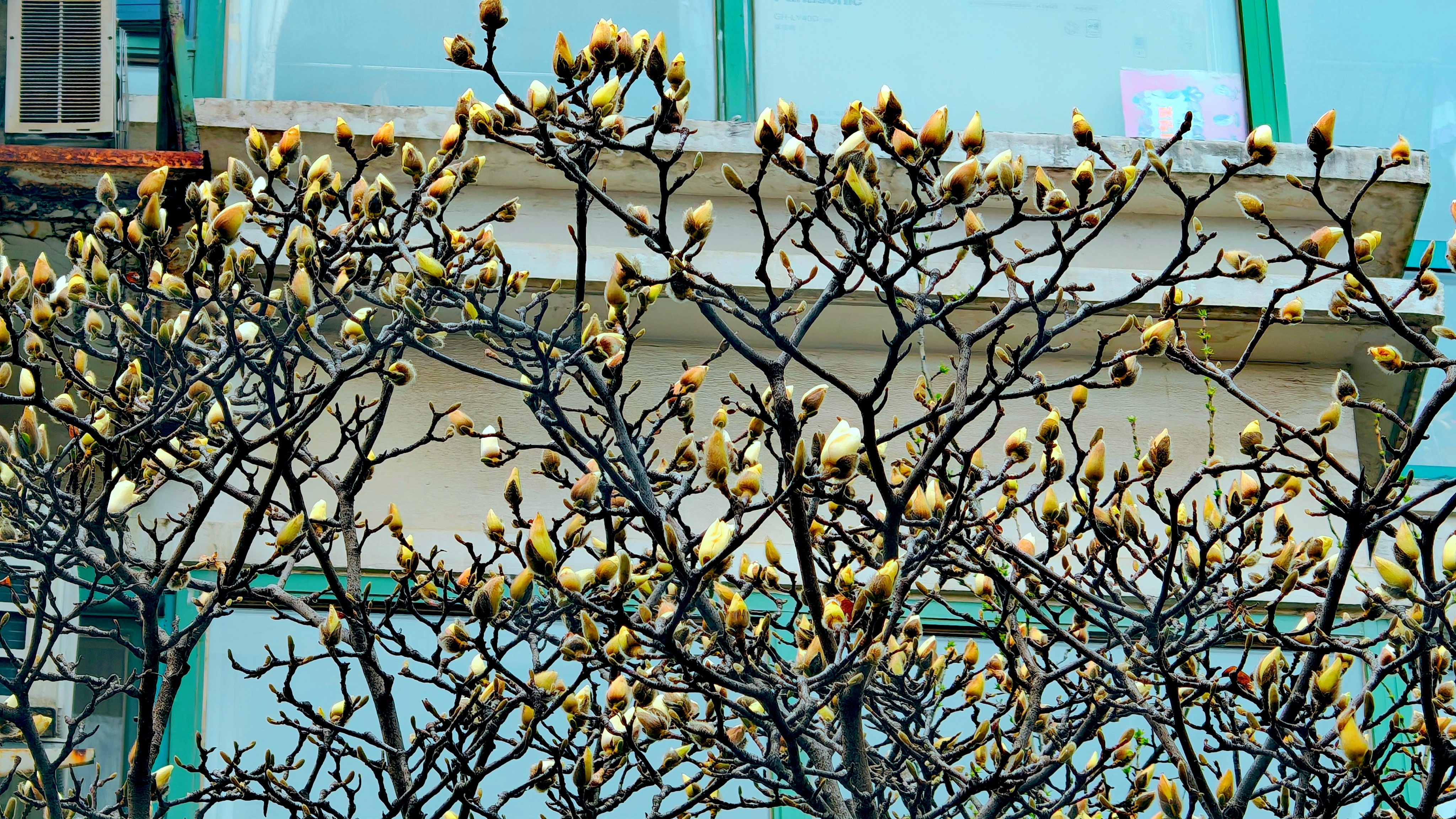 也许品种不同,我们小区的玉兰花,还没有大规模绽放。拍照时,我不断变换构图,时不时来个“虚实结合”。