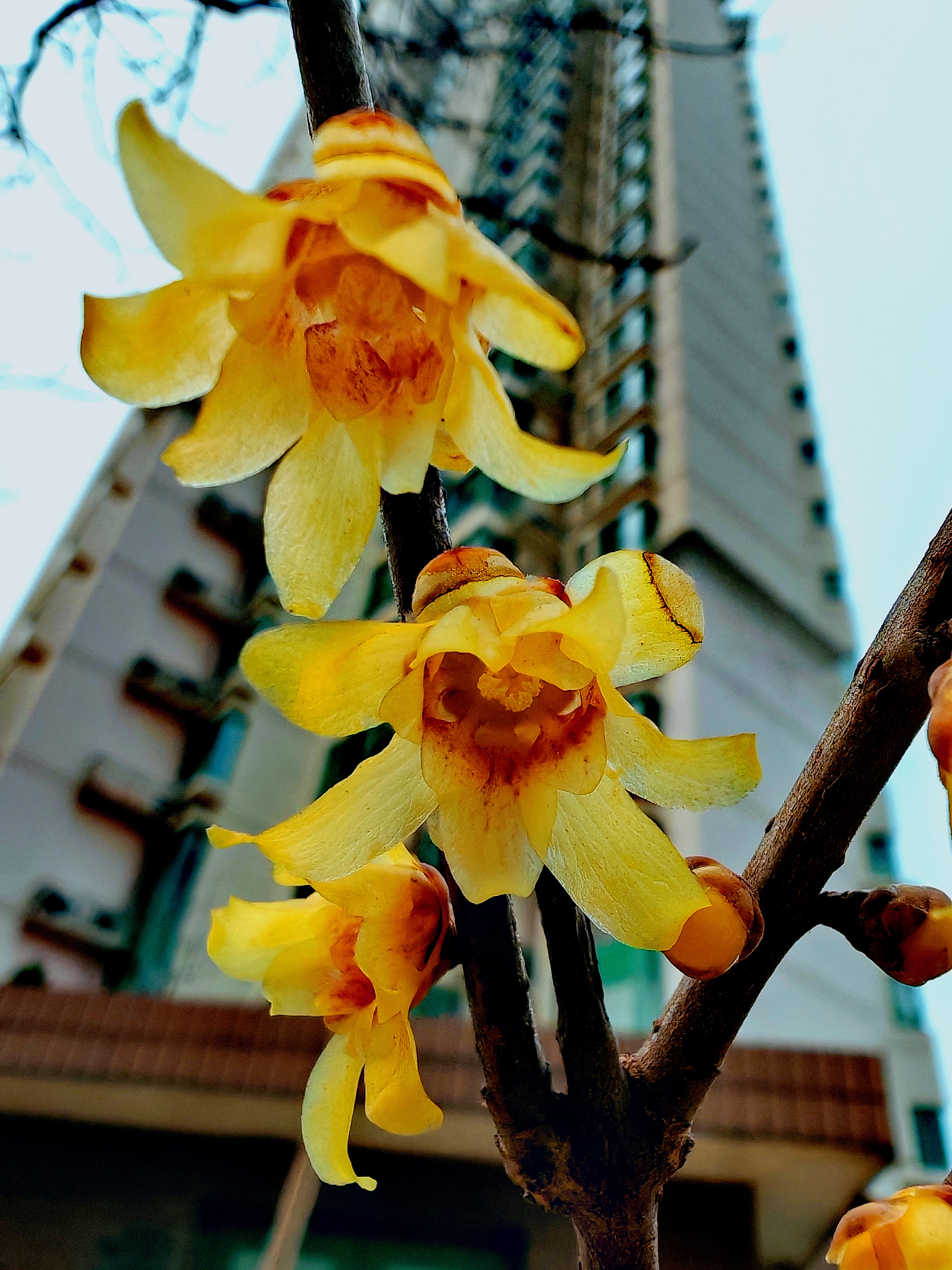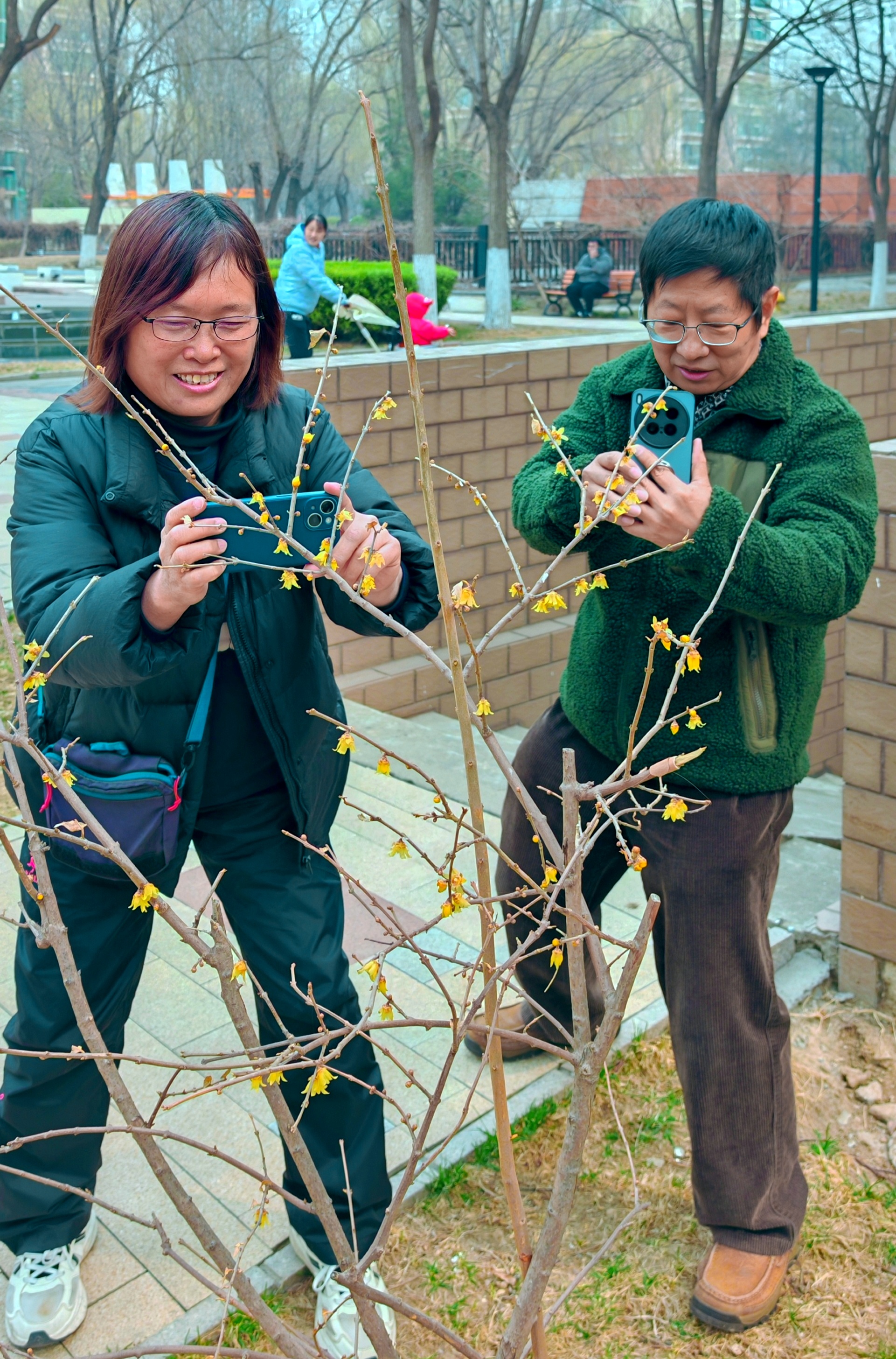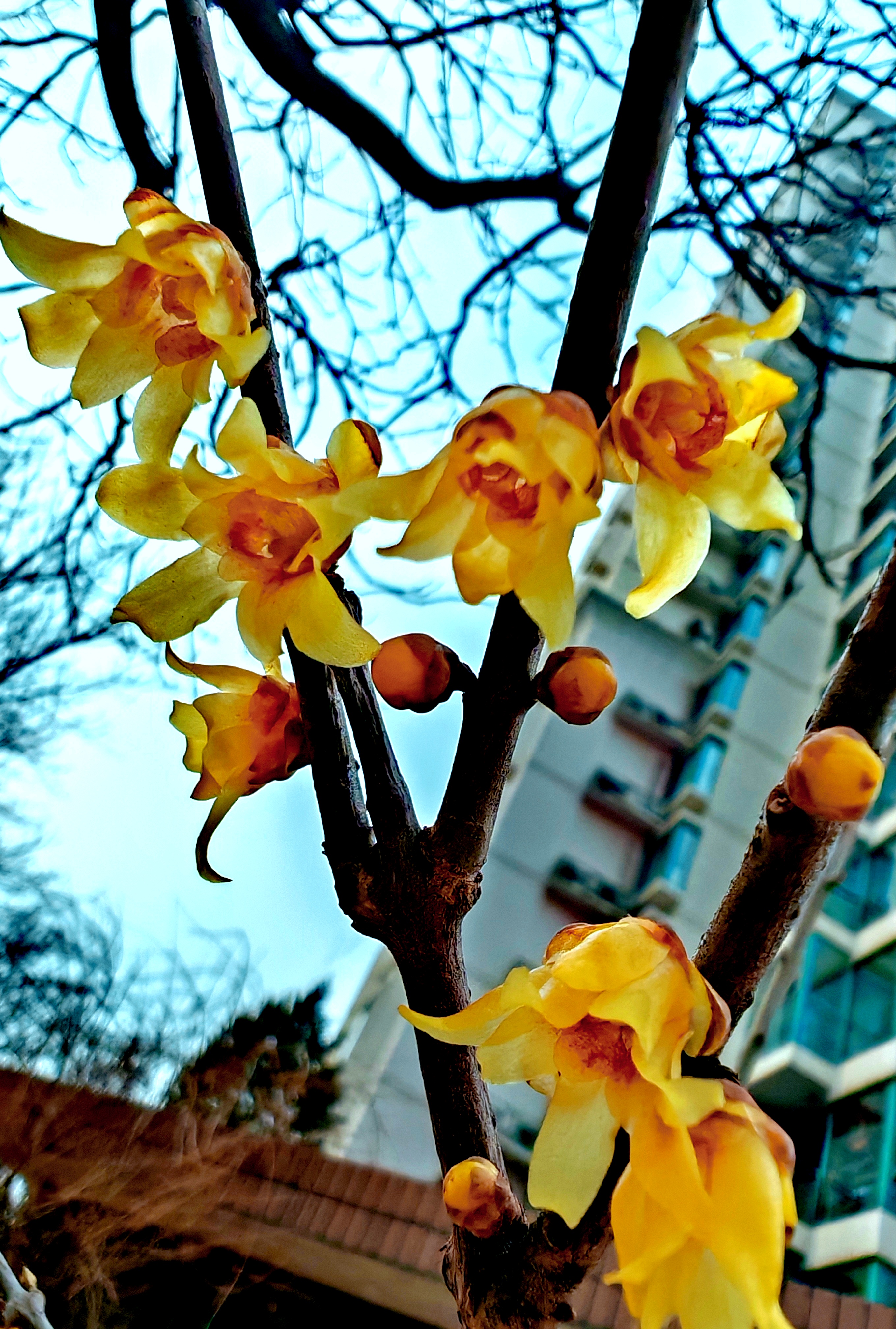 突然发现,小区里竟然有一株小小的蜡梅!不仔细瞧,很难发现。可把我们乐坏了!也吸引了路人。贴近,贴近,再贴近点儿拍……