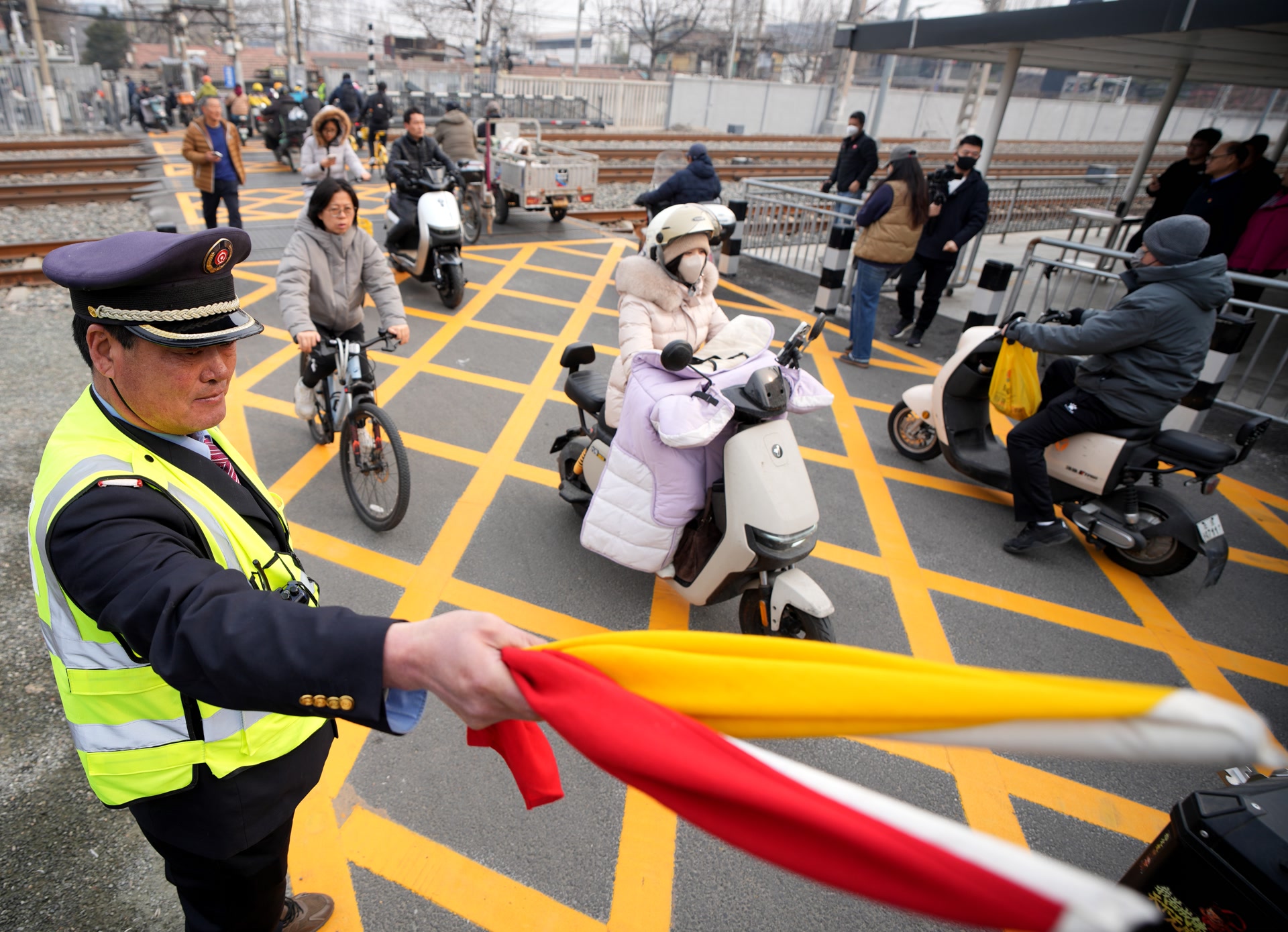 “大家靠右侧通行,减速慢行……”列车驶过,栏门抬起,车辆通行……道口工不停疏导这里的交通秩序,密集的非机动车与行人穿过道口。三分钟后,栏门关闭,避让下一驶来的列车。“每天,这里的栏杆启闭循环要一百五六十次,交替通行保障行车安全。”国铁北京局北京工务段副段长赵军介绍。