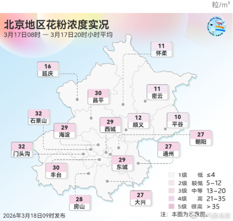 昨日北京城区大部花粉浓度等级为4级,为高级别。主要致敏花粉种类为榆科、杨柳科、柏科。