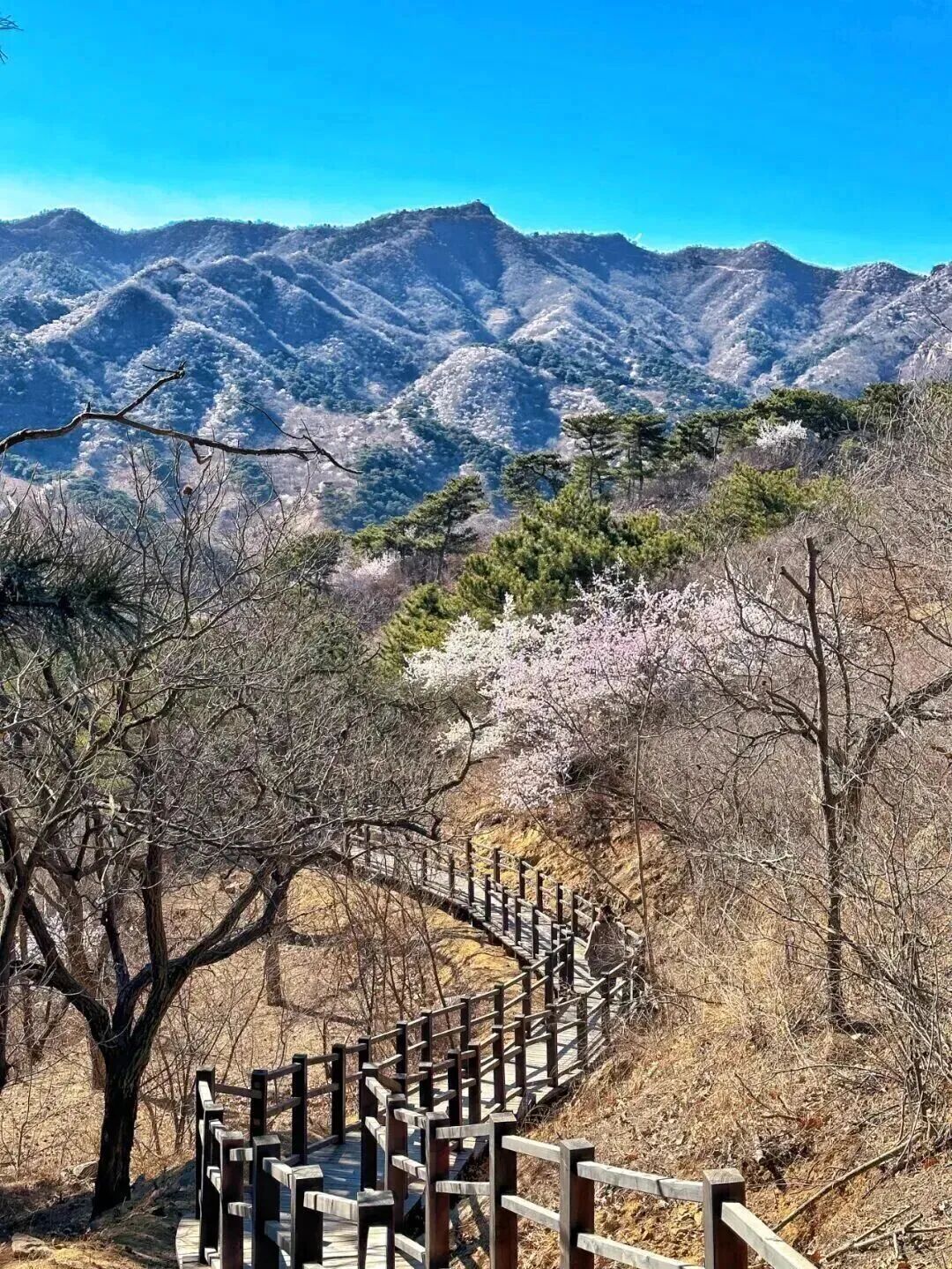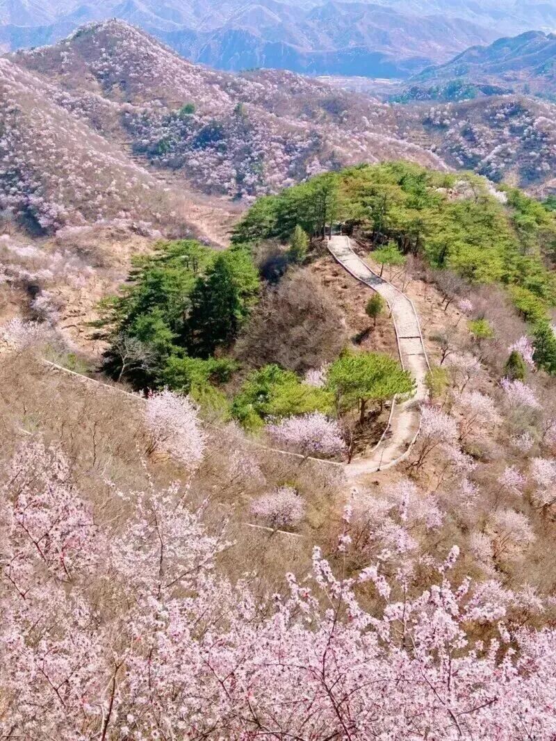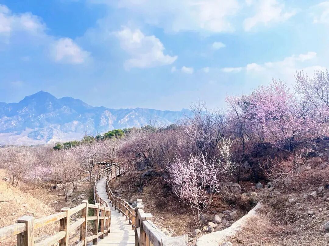 从千年古刹延寿寺出发,步道起点位于延寿寺牌楼旁,穿小木桥即可上山,沿途不仅能仰望古松苍翠,更能在这条路上感受“深山藏古寺,花枝出高墙”的禅意,步道沿途多杏树与山桃,春日花开时,漫山烂漫。