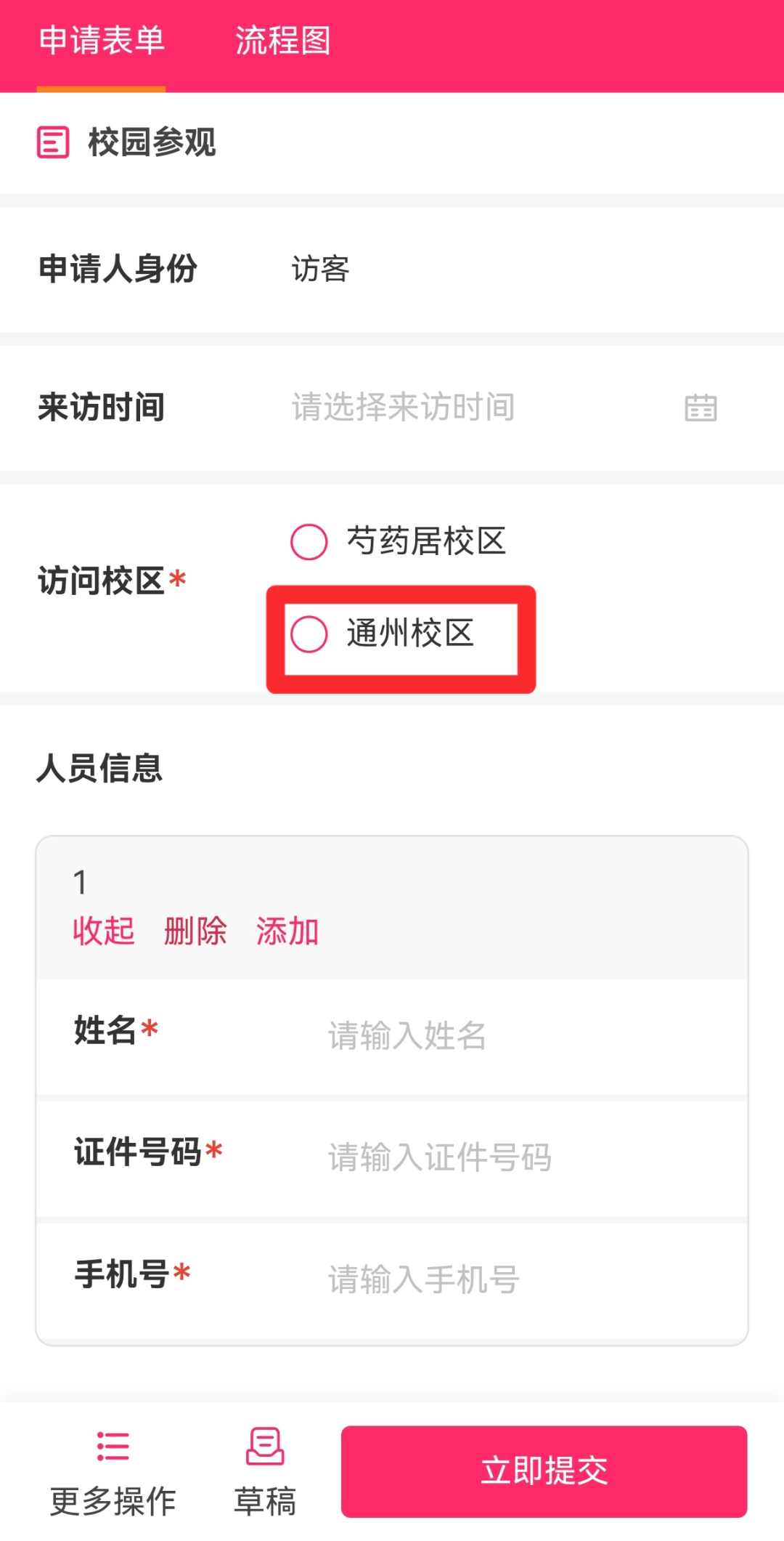 通过手机验证码登录后,选择“通州校区”,填写个人信息后点击“立即提交”即可。