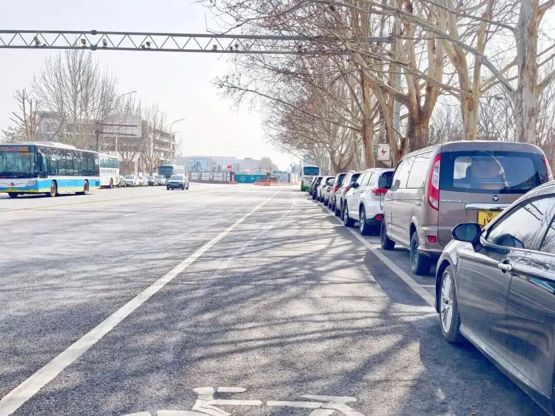 学校东门道路两侧有划线停车位,东门附近街道也有不少临时停车位。